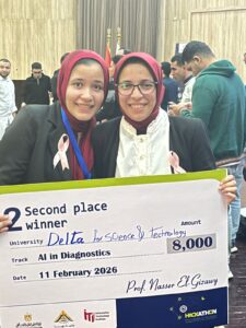 وفي إنجاز آخر، فاز فريق مكوّن من الطالبتين شهد خالد وآية وليد يوسف بالمركز الثاني ضمن مسار “الذكاء الاصطناعي في التشخيص”، تحت إشراف أ.م.د/ هناء سالم مرعي.