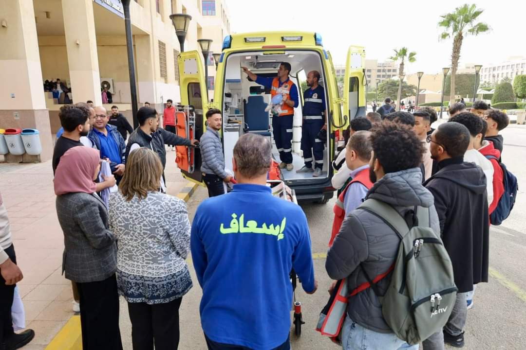 وتم تدريب الطلاب على كيفية التعامل مع نقل الاشخاص فى حالة الحوادث او الإغماء وحالات إنعاش القلب الرئوى، كما تم تعريف الطلاب عمليا على مكونات سيارة الإسعاف.