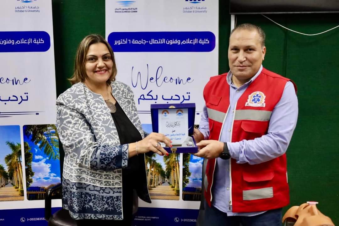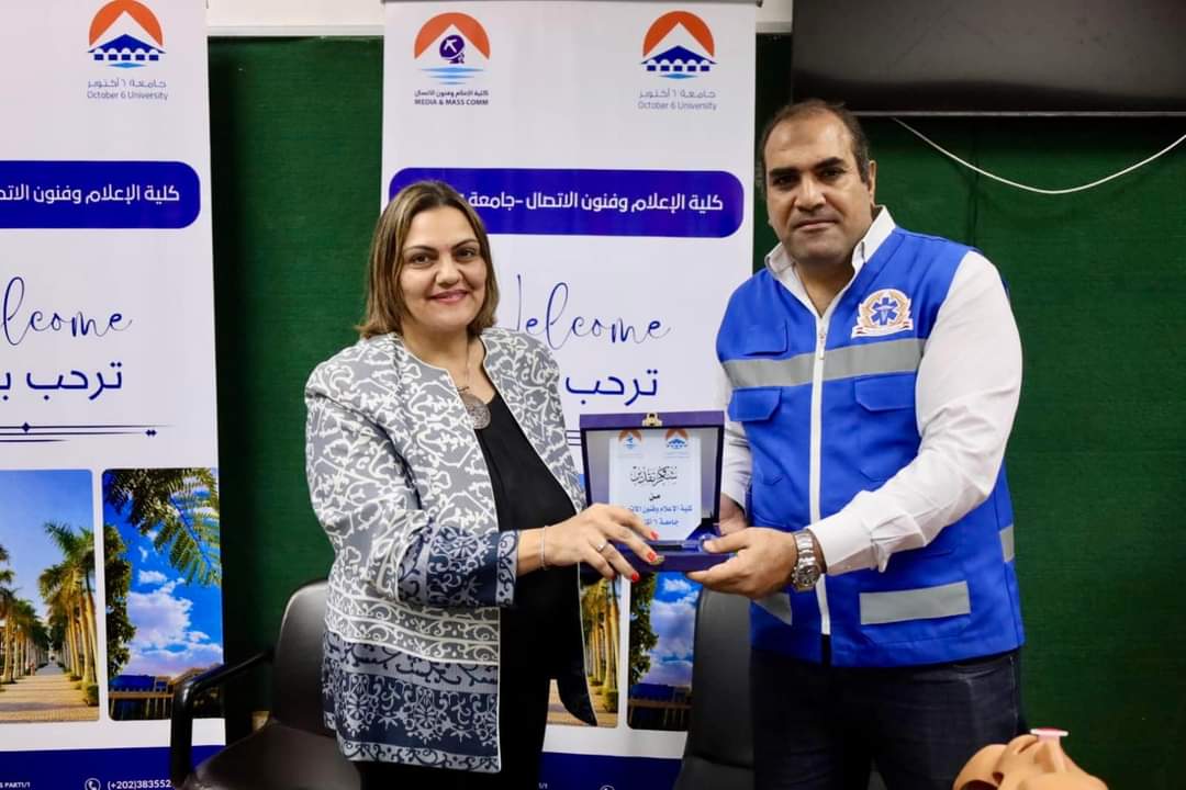 نظمت كلية الاعلام جامعة ٦ اكتوبر ندوة وورشة عمل عن الاسعافات الاولية بالتعاون مع هيئة الإسعاف المصرية تحت رعاية .د ممدوح مصطفى غراب رئيس جامعة ٦ أكتوبر و.دهشام تمراز نائب رئيس الجامعة لشئون البيئة وخدمة المجتمع وتحت قيادة .د دينا فاروق أبوزيد عميد كلية الإعلام وفنون الاتصال بالجامعة .شارك فى الندوة الدكتور عمرو رشيد .وتم تنظيم ورشة عمل عن الإسعافات الأولية التى يمكن الاستعانة بها فى حالة حدوث أى طوارئ أو حوادث لإنقاذ حياة الأفراد حولنا، وقدم الورشة الدكتور محمد حسين مدير إسعاف ٦ أكتوبر ، ومؤنس أبوسريع مدير إدارة الإعلام بهيئة الإسعاف المصرية وأ.أحمد سامى مشرف قطاع ٦ إكتوبر .