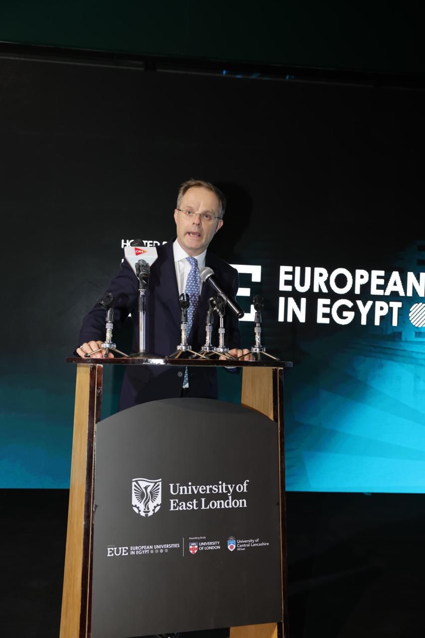 ومن جانبه عبر السفير الانجليزى Gareth Baileyعن بالغ سعادته بوجود ثلاثة فروع من أعظم الجامعات والتي تقدم برامجها التدريسية والبحثية بالجامعات الأوروبية في مصر (EUE) بالعاصمة الإدارية وهي جامعة لندن (UOL) و جامعة وسط لانكشير (UCLan) و جامعة شرق لندن (UEL).