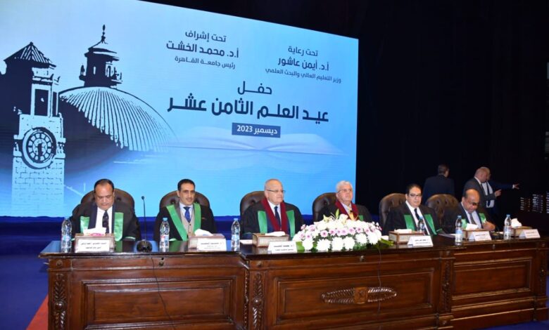 احتفالية جامعة القاهرة بعيد العلم الثامن عشر لتكريم علمائها الفائزين بجوائز الدولة والجامعة