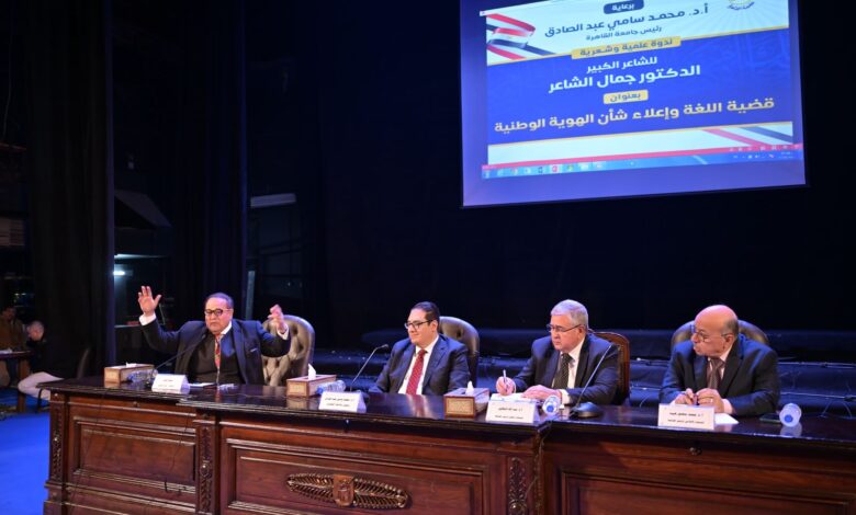 وتطرق الدكتور جمال الشاعر، إلى علاقة اللغة بالبعد الوطني والقومي في ظل التحديات المعاصرة التي تستهدف هدم اللغة والتشويش علي العقل العربي، وكيفية تحصين الشباب لكي يظل عربي الفكر ويحترم الرموز الثقافية والفكرية، مشيرًا إلي خطورة تراجع اللغة وهو ما يستدعي ضرورة توظيف وتعريب العلوم بإعتبار أن اللغة هي وسيلة للمعرفة وليست مجرد بلاغة وقدرة على التعبير، وأن تعريب العلوم يُتيح المعرفة الحديثة المتطورة.