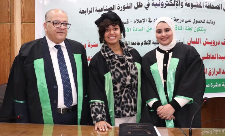 وحظيت الباحثة بإشادة أعضاء اللجنة لما قدمته من تحليل معمّق ورؤية بحثية قادرة على استشراف مستقبل المهنة، مع تقديم توصيات عملية قابلة للتطبيق داخل المؤسسات الإعلامية المصرية.