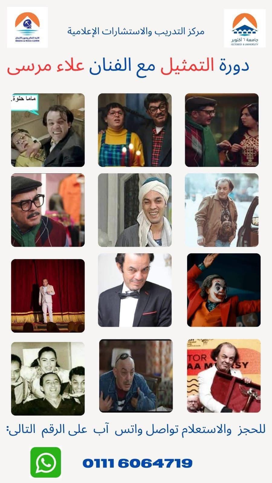 أعلن مركز التدريب والاستشارات بكلية الإعلام وفنون الاتصال جامعة ٦ أكتوبر عن عقد دورة تدريبية حضورى وأون لاين بعنوان التمثيل الاحترافي “للفنان علاء مرسي”.تعقد الدوره تحت رعاية الدكتور ممدوح غراب رئيس الجامعه والدكتوره دينا فاروق ابو زيد عميدة الكليه .وتبدأ الدوره اعتبارا من يوم الاحد القادم وحتى يوم ١٩ اغسطس وتستمر لمدة ٣ ايام