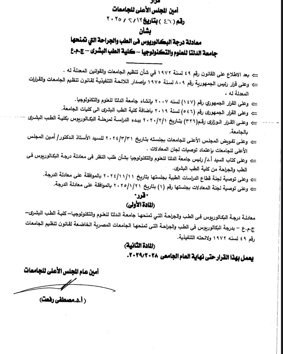 الاعلى للجامعات يعادل بكالوريوس طب جامعة الدلتا بشهادات طب الجامعات المصريه