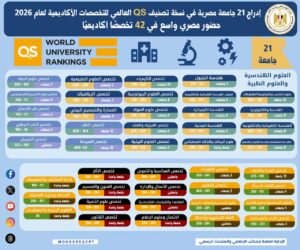 أعلن تصنيف QS العالمي، نتائج نسخته للتخصصات الجامعية للعام 2026، والتي أظهرت إدراج 21 جامعة مصرية، وذلك ضمن 1900 مؤسسة تعليمية شملها التصنيف من أكثر من 100 دولة حول العالم.