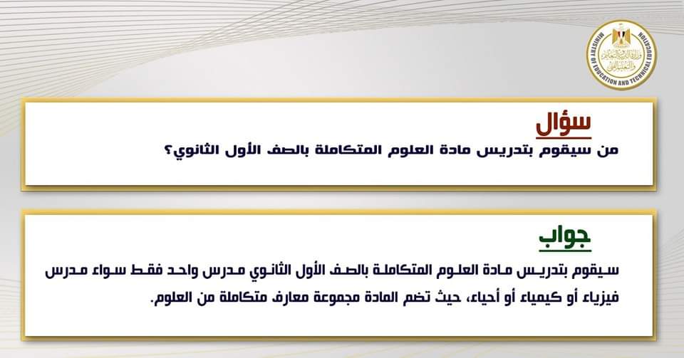 ردت وزارة التربية والتعليم على بعض التساؤلات التى وردت إليها من الطلاب وأولياء الأمور حول معلمى مادة العلوم المتكامله وتدريس مادة الحاسب الالي.