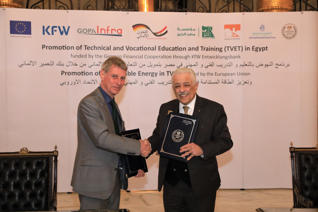 وقع الدكتور طارق شوقي وزير التربية والتعليم والتعليم الفني، اليوم، مع السيد ماتياس لويج المدير التنفيذي لشركة جوبا انفرا GOPA-Infra الألمانية للاستشارات، عقد تنفيذ مشروع النهوض بالتعليم الفني والتدريب المهني وتعزيز الطاقة المستدامة في التعليم الفني والتدريب المهني.