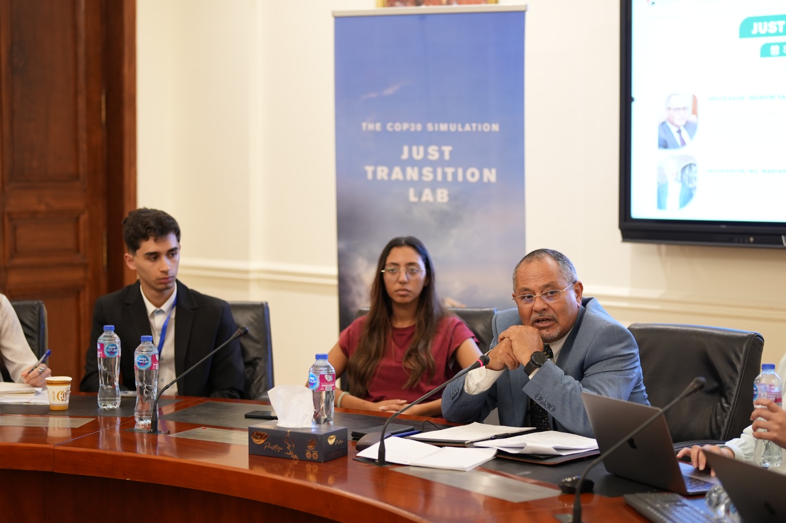 وشهدت الجلسة محاكاة تفاعلية تناولت مختلف العوامل المؤثرة في مسار الانتقال العادل، بما في ذلك الاتفاقيات والمعاهدات الدولية، والنزاعات، والأمن المناخي، مؤكدة أن الانتقال العادل لا يُقصد به التغيير في حد ذاته، بل خلق بيئة أكثر استدامة وعدلاً وصحة للإنسان والمجتمعات. وقدّم الطلاب خلال الجلسة مجموعة من الحلول والتوصيات لعرضها على لجنة المناخ، حيث أشاد الدكتور سلامة بما قدّموه من رؤى مبتكرة وتحليلات واقعية، وتبادل معهم النقاش حول السبل العملية لترجمة هذه الأفكار إلى سياسات قابلة للتطبيق.