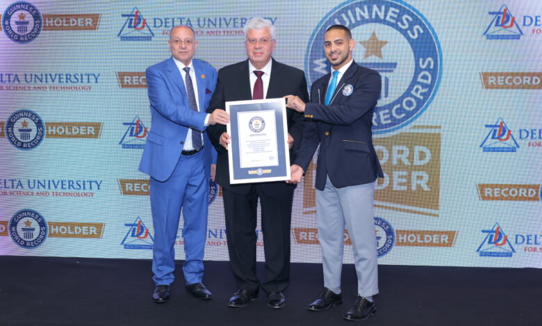 شهد الدكتور ايمن عاشور وزير التعليم العالى نيابة عن المهندس مصطفى مدبولى رئيس الوزراء والدكتور ايمن مختار محافظ الدقهلية ولفيف من الوزراء السابقين ورؤساء الجامعات والعمداء تسلم الدكتور محمد ربيع ناصر شهادة موسوعة جينيس للارقام القياسية لعلاج مستشفى الاسنان بالجامعة 50الف مريض خلال شهر وهو ما يعزز مكانة جامعة الدلتا للعلوم والتكنولوجيا كإحدى المؤسسات الرائدة في مجال طب الأسنان على مستوى العالم. ويأتي هذا الإنجاز تأكيدًا على التزام الجامعة بتقديم خدمات رعاية صحية عالية الجودة للمجتمع، ودعم جهود الدولة المصرية في الارتقاء بمنظومة الرعاية الصحية، وقد تم تسليم شهادة موسوعة جينيس للأرقام القياسية لمستشفى الأسنان بجامعة الدلتا للعلوم والتكنولوجيا في حفل رسمي ضخم برعاية ودعم الدكتور محمد ربيع ناصر رئيس مجلس الامناء حضرها عددا كبيرا من الوزراء والمحافظين ورؤساء الجامعات، منهم الدكتور محمد عوض تاج الدين مستشار الرئيس، والدكتور مفيد شهاب رئيس وزير التعليم العالى السابق والدكتور أحمد زكى بدر وزير التنمية المحلية الاسبق ورئيس مجلس امناء جامعة 6 أكتوبر والدكتور سيد عبدالخالق وزيرالتعليم العالى السابق، والدكتور صالح هاشم رئيس جامعة عين شمس الأسبق والدكتور مصطفى رفعت أمين المجلس الاعلى للجامعات والدكتور عبدالوهاب عزت أمين مجلس الجامعات الخاصة، والدكتور ايمن مختار محافظ الدقهلية، المهندس احمد حسين فايق رئيس مجلس ادارة شركة صبور، والدكتور شريف خاطر رئيس جامعة المنصورة، والدكتور منصور كباش رئيس جامعة سفنكس والدكتور معوض الخولى رئيس جامعة المنصورة الجديدة والدكتور طارق صلاح لجنة قطاع الأسنان .كما شهد الأحتفال المهندس اسامه ربيع والمهندس محمد ربيع نائبى رئيس مجلس الأمناء وعدد من رؤساء الجامعات وعمداء كليات طب الفم والأسنان وممثلين عن النقابة وأعضاء هيئة التدريس والإعلاميينمنهم الدكتور وجدى زين الدين رئيس تحرير الوفد والاستاذ رفعت فياض مدير تحرير اخبار اليوم وعصام كامل رئيس تحرير فيتو ومحمد الصيام مدير تحرير الجمهوريه وزكى السعدنى مدير تحرير الوفد .