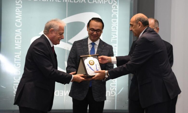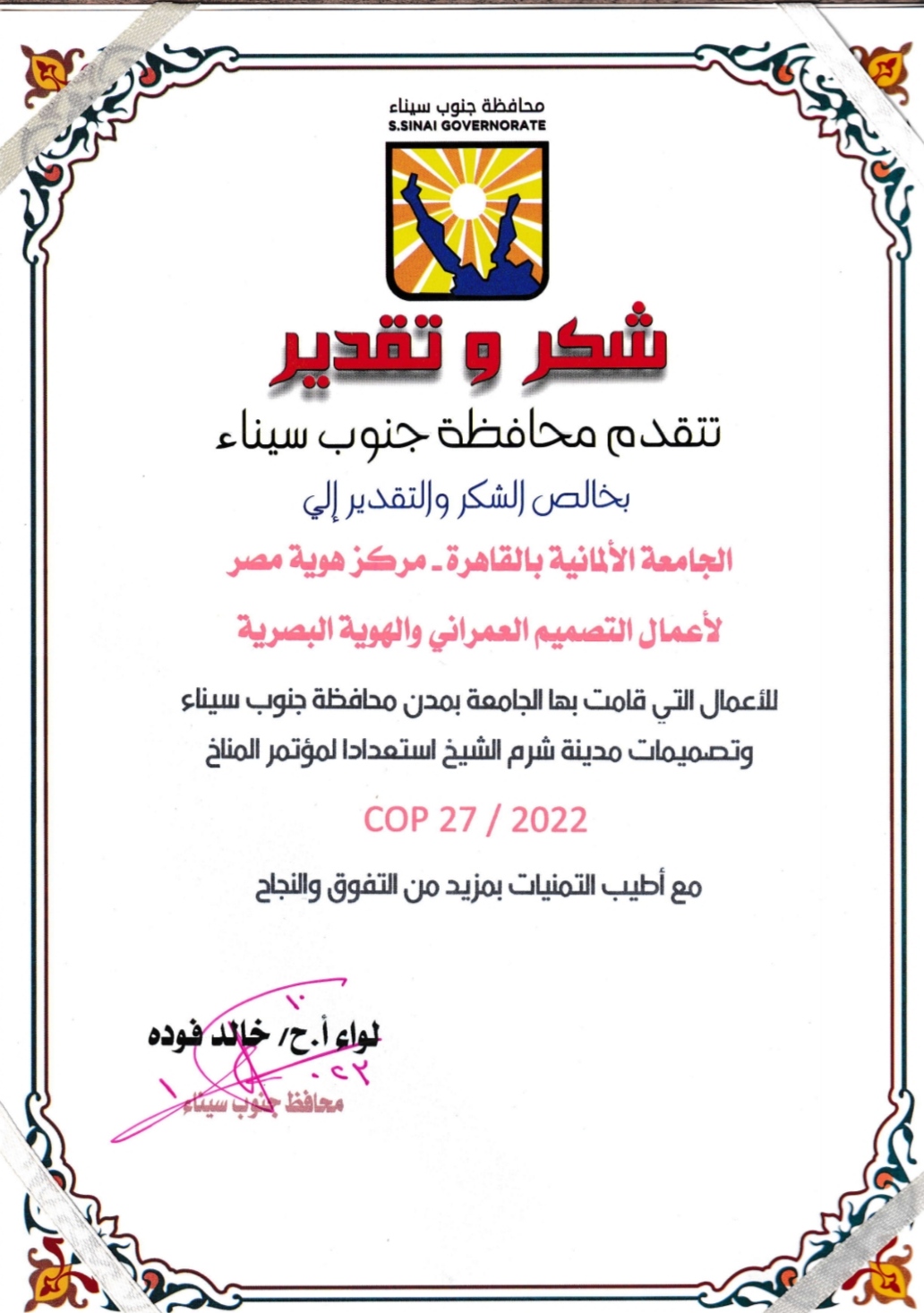 شهدت الجامعة الألمانية في القاهرة، مراسم حفل تكريم اللواء خالد فودة محافظ جنوب سيناء للجامعة نظير المجهود المبذول من جانب فريق عمل مركز هوية مصر لتطبيق مفردات الهوية البصرية بمدن محافظة جنوب سيناء ( شرم الشيخ – نويبع – دهب – سانت كاترين – طابا – الطور ) والمشاركة الفاعلة بالمشروعات التى أقيمت بمدينة شرم الشيخ تحضيراً لمؤتمر المناخ والتى كان لها بالغ الأثر فى النجاح العالمى لمؤتمر قمة المناخ COP27.
