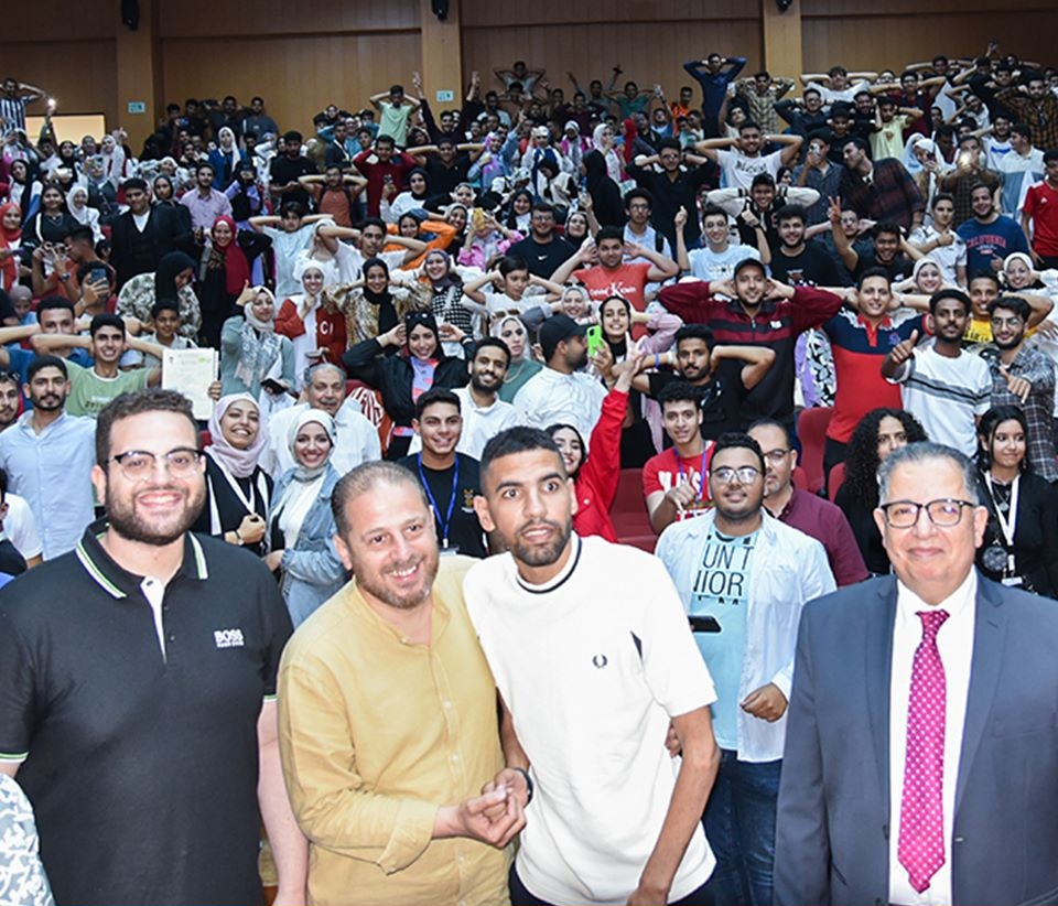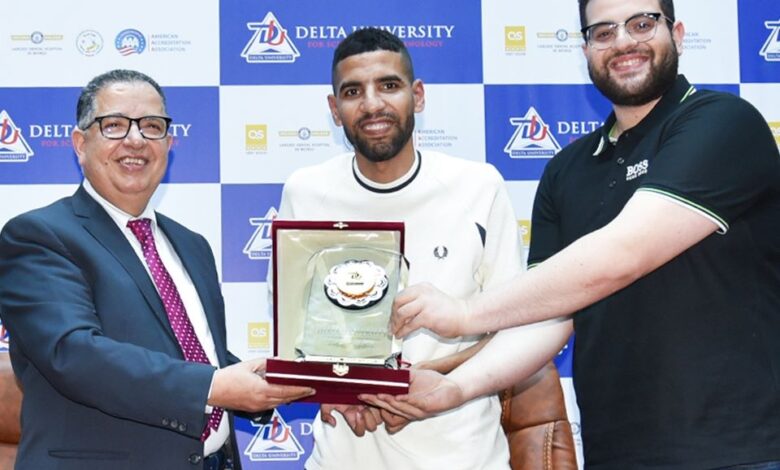 المهندس محمد ربيع والدكتور يحى المشد يكرمان الكابتن مؤمن زكريا بجامعة الدلتا