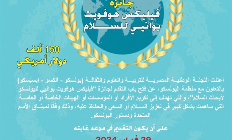 أعلنت اللجنة الوطنية المصرية للتربية والعلوم والثقافة (يونسكو – ألكسو – إيسيسكو) بالتعاون مع منظمة اليونسكو، عن فتح باب التقدم لجائزة “فيليكس هوفويت بوانيي لليونسكو لأبحاث السلام”، والتي تهدف إلى تكريم الأفراد أو المؤسسات أو الهيئات الخاصة أو العامة التي ساهمت بشكل كبير في تعزيز السلام أو السعي والحفاظ عليه، وذلك وفقًا لميثاق الأمم المتحدة ودستور اليونسكو.