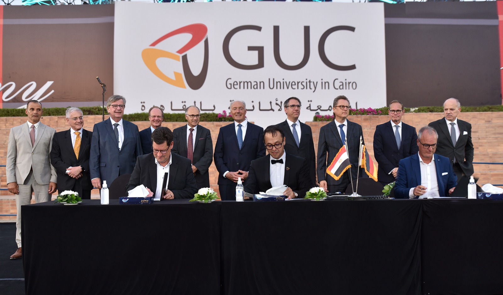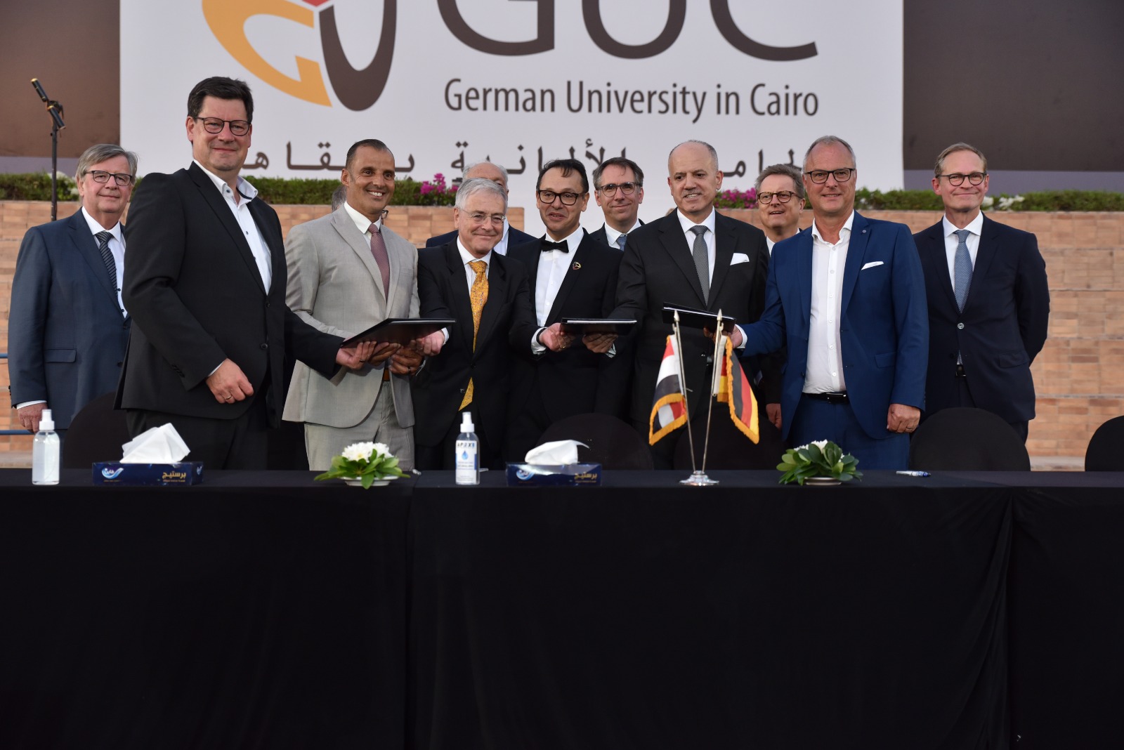 ولفت الدكتور منصور إلى انه على هامش الأحتفالية التي استمرت على مدار 3 ايام بمشاركة 76 شخصية المانية استكملت فرحتنا بتوقيع اتفاقية علمية لتعزيز التميز في التدريس والبحث وتطوير حلول مبتكرة لتحديات العالم الحديث و التعاون في البحث العلمي و التبادل الطلابي والتدريب الداخلي و تنفيذ برامج تعليمية مشتركة لطلاب وخريجي الجامعات الثلاث الألمانية بالقاهرة – GUC الألمانية الدولية في العاصمة الإدارية الجديدة — GIU الجامعة الألمانية الدولية في برلين GIU Berlin ، حيث تم توقيع الاتفاقية مع السيد جوليان أوزوالد عمدة فرويدنشتات ، السيد ستيفان بوجنيدر رئيس جامعة شوارزوالد ، شهد توقيع الإتفاقية السيد يوليوس جورج لوي رئيس مجلس أمناء الجامعة الألمانية الدولية – الدكتور ياسر حجازي رئيس الجامعة الألمانية بالقاهرة – الدكتور سليم عبد الناظر رئيس الجامعة الألمانية الدولية ، وتم ذلك فى حضور وفد المانى رفيع المستوى على رأسه السيد مايكل مولر، عضو البوندستاج الألماني ، السيد ويلي شتيشلى، عضو البرلمان ورئيس اللجنة البرلمانية لأوروبا والشؤون الدولية ، السيد فرانك هارتمان، سفير دولة ألمانيا الإتحادية في مصر ، المهندس دانيال ساندر، المدير العام للمجلس الاقتصادي بولاية بادن فورتمبيرج – المسؤل عن 12.600 ألف شركة المانية تقوم بتدريب طلاب وخريجي الجامعة ، الدكتور كاى زيكس، السكرتير العام للهيئة الألمانية للتبادل العلمى DAAD، الدكتور ميشائيل فيبر، رئيس جامعة أولم وعضو مجلس الامناء ، ومن الجانب المصرى السفير عمر سليم مساعد وزير الخارجية لشئون العلاقات العلمية و الثقافية بوزارة الخارجية ، الدكتورة دارين حسن أبو النجا المستشار بوزارة الخارجية،وعدد من رجال الصناعة و الأقتصاد من الحضور بالإحتفالية.