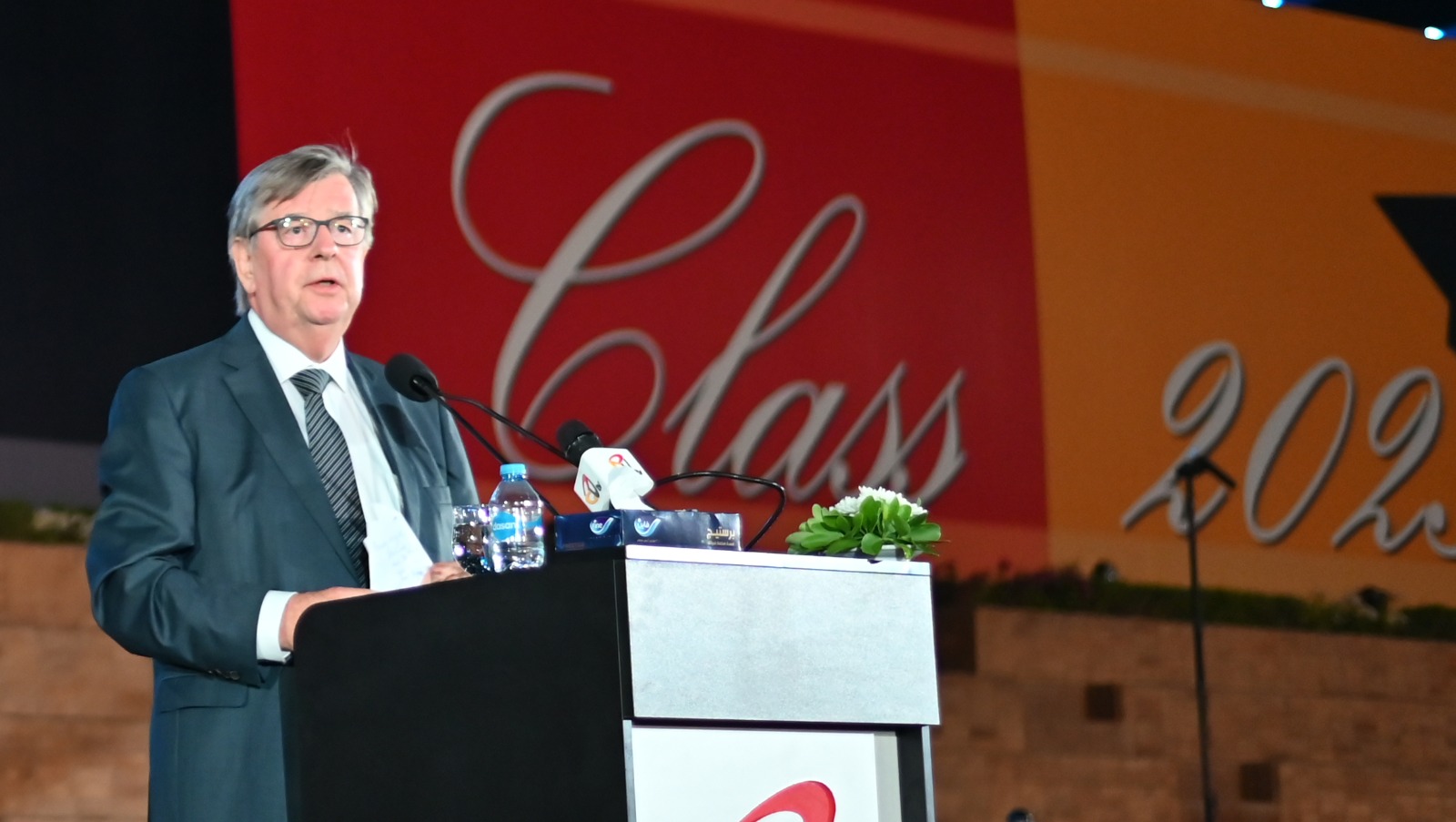 و أضاف انه سعيد بالمشاركة في الاحتفالية التي تشهد تخريج العديد من الشباب الذين اختاروا الدراسة في الجامعة الألمانية للحصول على شهادتهم من واحدة من أفضل الجامعات في مصر ، مشيرا إلى ان التعليم العالي و البحث العلمي يعدان ركيزتان اساسيتان للتعاون بين مصر وألمانيا و ان خريجي الجامعة لديهم القدرة على تشكيل المستقبل و بناء جسور للتواصل و الصداقة بين البلدين ، حيث اتيحت لهم الفرصة على مدار أعوام دراستهم بالجامعة السفر إلى المانيا و التعرف بشكل أعمق على دولة المانيا و اكتساب اللغة الالمانية بجانب الدراسة في حرم الجامعة الألمانية في برلين.