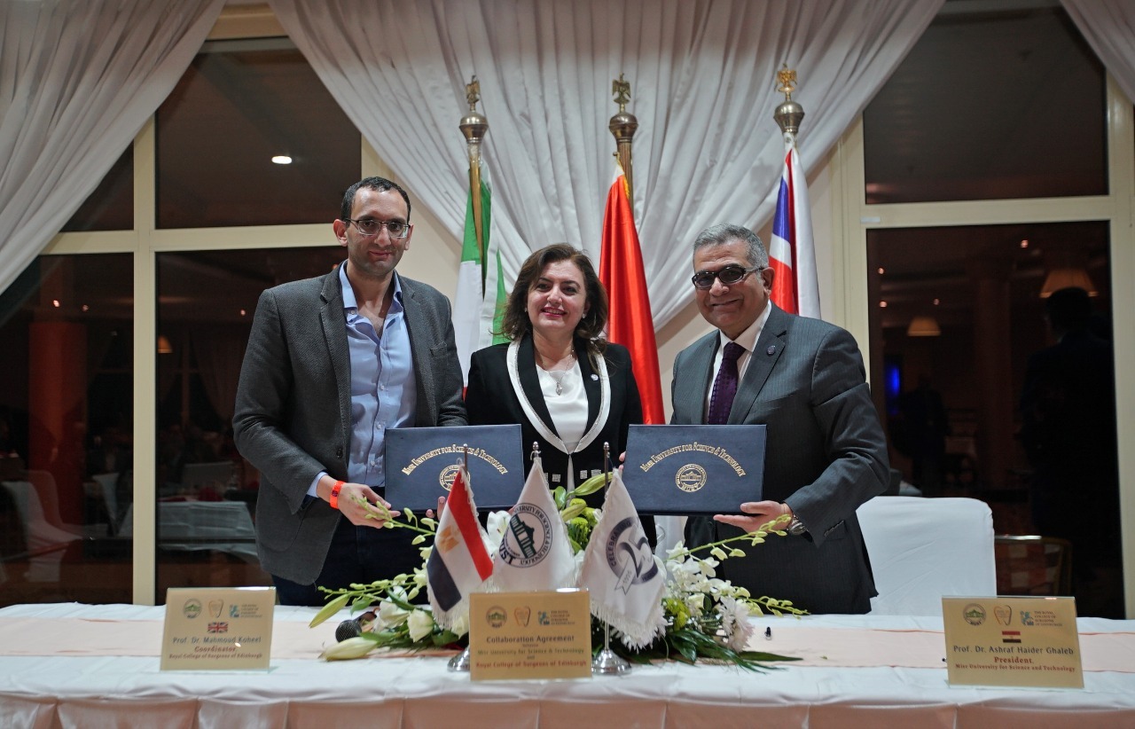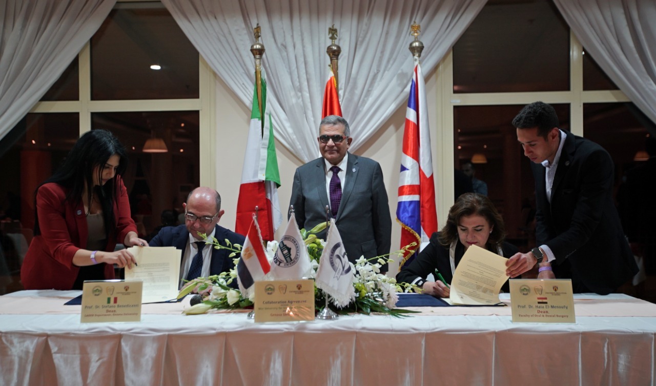 وأضافت د. هالة المنوفي أنه تم توقيع بروتوكول تعاون مع منسق الكلية الملكية البريطانية وذلك لاعتماد برنامج الزمالة البريطانية في كلية طب الاسنان جامعة مصر للعلوم والتكنولوجيا على ان يكون تحت إشراف جميعة الجراحين الملكية، ووقع عن جامعة مصر الدكتور أشرف حيدر رئيس جامعة مصر للعلوم والتكنولوجيا، وبروتوكول آخر خاص ببدء الدراسة في برنامج ماجستير تطبيق الليزر والخاص بجامعة جنوا الايطالية ليدرس لأول مرة خارج الجامعة وداخل رحاب جامعة مصر للعلوم والتكنولوجيا وقام بتوقيع البروتكول عميد كلية طب جراحة الفم والاسنان جامعة مصر للعلوم والتكنولوجيا، وعميد معهد تطبيقات الليزر بجامعة جنوا الايطالية، وأعلنت عميد الكلية أن رئاسة المؤتمر الشرفية كانت لكل من الدكتور أشرف حيدر رئيس جامعة مصر للعلوم والتكنولوجيا، والدكتور طارق صلاح الدين رئيس لجنة قطاع طب الأسنان، والدكتور ستيفانو بن دشنتي عميد معهد تطبيقات الليزر بجامعة جنوا الإيطالية.