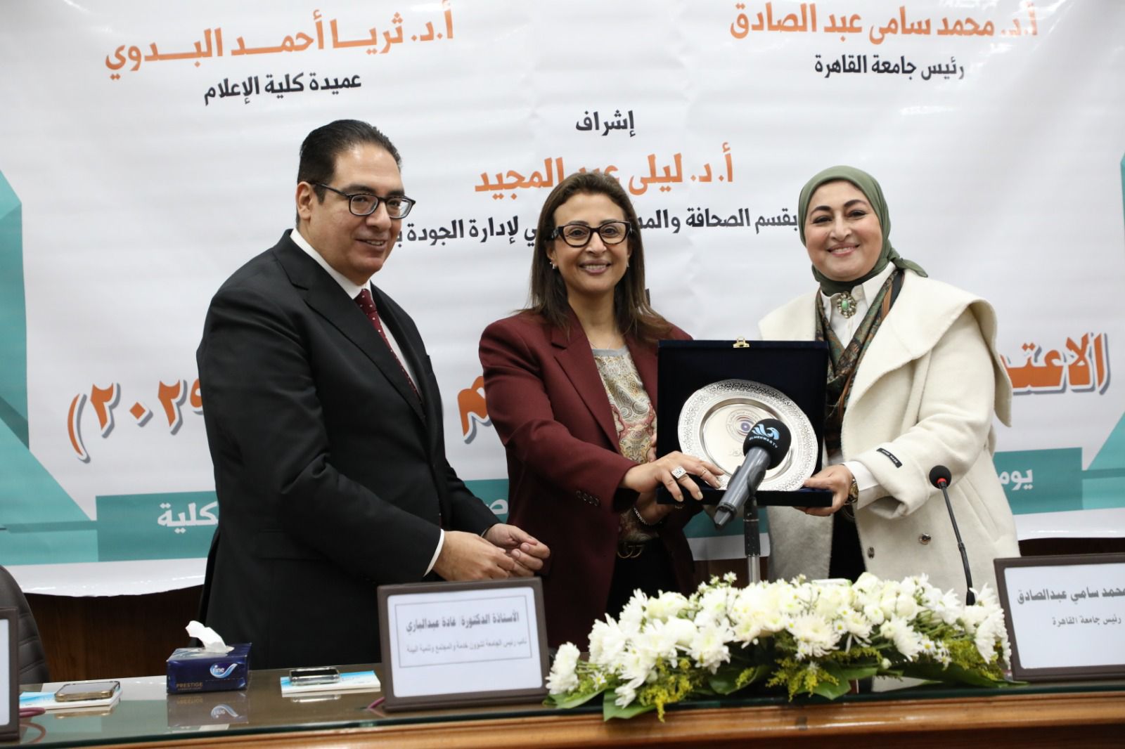 وفي كلمتها أكدت الدكتورة هويدا مصطفى العميد السابق للكلية، أن كلية الإعلام وقياداتها بذلت جهدا كبيرا في الحصول على هذا الاعتماد وقدمت لائحة جديدة للدراسة، وخصصت برامج كاملة تؤهلها للحصول على هذا الاعتماد، كما ذكرت أن جميع الأعضاء كانوا يعملون بحب وامتنان لأساتذتهم.