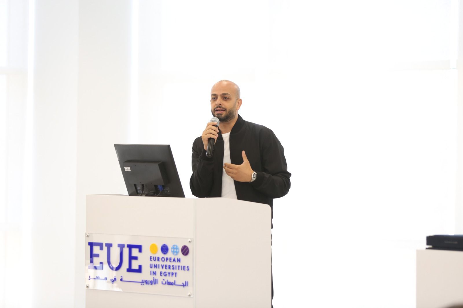 وخلال كلمته أشاد الكاتب والسيناريست أحمد مراد بالجامعات الاوروبية وبرامجها واهتمامها الخاص بعلم النفس والذي يظهر بوضوح في رواياته و ادار حوارا مع الطلاب أشار فيه ان العمل الجاد هو الطريق الى التميز وان دورنا كمصريين ان نعمل بجد وإخلاص للحفاظ عل هويتنا وابراز قدرتنا على التميز والمنافسة في كافة المجالات، كما تحدث عن اهم اعمال وكتابته وكيف نجح فى تطوير ذاته وتعلمه المستمر.