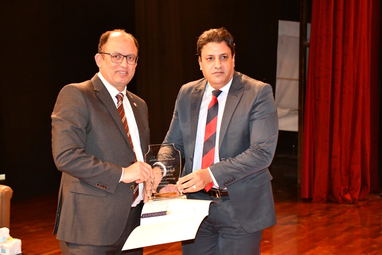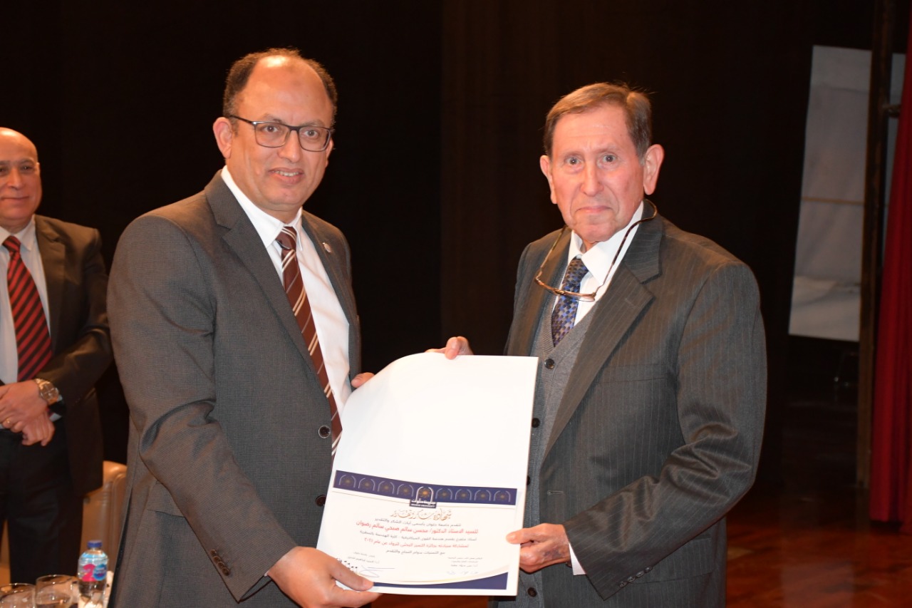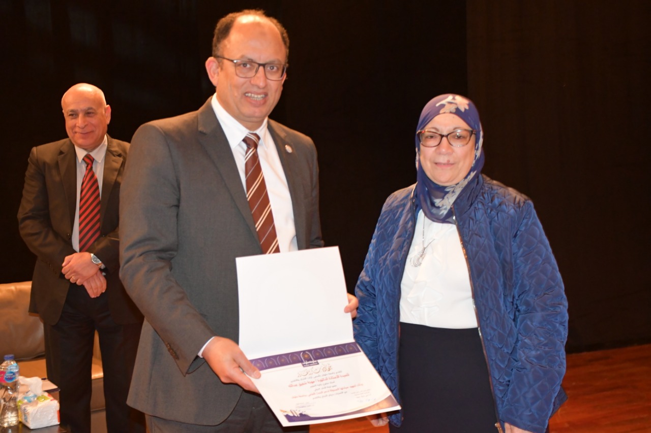 وخلال الاحتفالية تم تكريم الاستاذ الدكتور السيد قنديل، والاستاذة الدكتورة منى فؤاد عطية على جهودهما في دعم البحث العلمي بالجامعة.