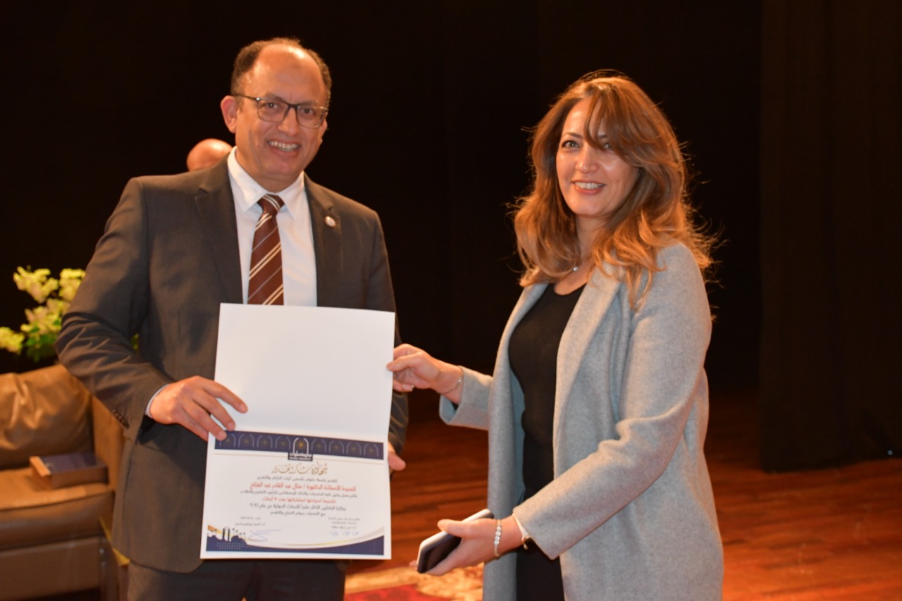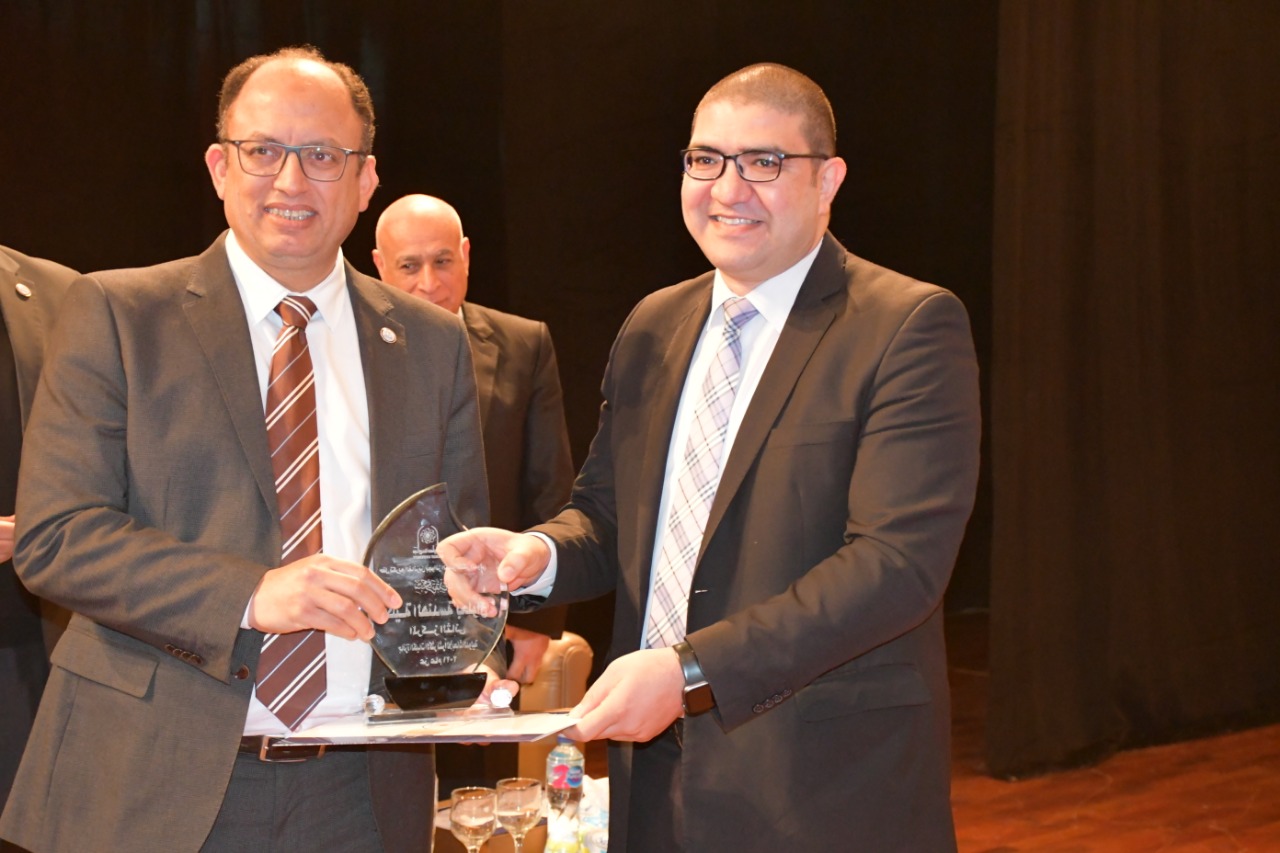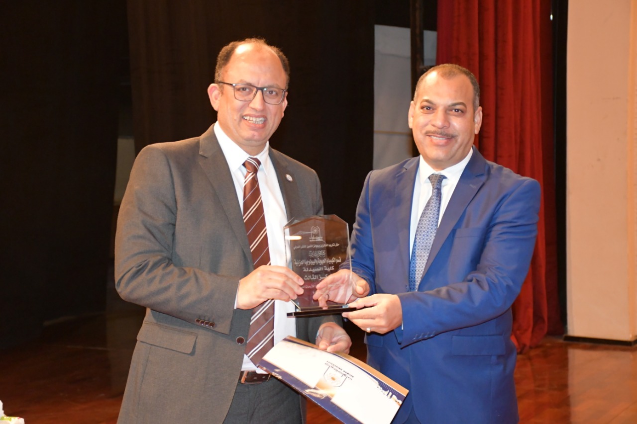 وخلال الاحتفالية تم تكريم الاستاذ الدكتور السيد قنديل، والاستاذة الدكتورة منى فؤاد عطية على جهودهما في دعم البحث العلمي بالجامعة.