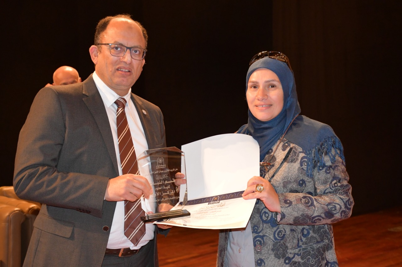 الاستاذة الدكتورة أماني أبو النصر رئيس قسم النبات بكلية العلوم بإجمالي (42 بحث)، المركز الثاني وفاز بها قسم الامراض المتوطنة بكلية الطب وتسلم الجائزة: