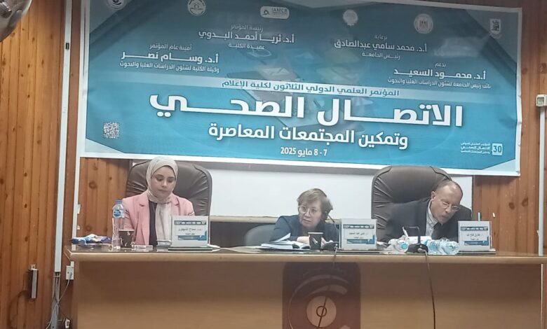 جاء ذلك في إطار رئاستها للجلسة البحثية الثامنة، التي انعقدت ضمن فعاليات اليوم الثاني لمؤتمر كلية الإعلام جامعة القاهرة العلمي الدولي الثلاثين تحت عنوان “الاتصال الصحي وتمكين المجتمعات المعاصرة”، والذي يناقش عددا من القضايا المرتبطة بالصحة والطب ودور وسائل الإعلام في التوعية في هذا المجال.