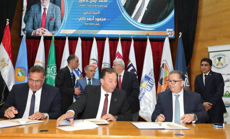شهد د. أيمن عاشور وزير التعليم العالى والبحث العلمى، توقيع بروتوكول تعاون لعقد تحالف مشترك، يعُد الأكبر من نوعه على المستوى العلمي والبحثي والصناعي والاستثماري، بين المؤسسات الأكاديمية والإنتاجية بإقليم الدلتا، ويضم التحالف ١٤ جامعة حكومية وأهلية وتكنولوجية وخاصة، وهى جامعات: (طنطا، والمنصورة، والمنوفية، وكفر الشيخ، ودمياط، ومدينة السادات، والمنصورة الأهلية، والمنصورة الجديدة، والمنوفية الأهلية، والدلتا للعلوم والتكنولوجيا، وحورس، والدلتا التكنولوجية، وسمنود التكنولوجية، والسلام الخاصة)، وممثلين عن اتحاد الصناعات المصرية “فرع دمياط الجديدة”، ومن القطاع الخاص؛ شركة انطلاق لتقنية الاتصالات والمعلومات، وشركة طنطا موتورز، وشركة سنابل الخير للحلول الزراعية.
