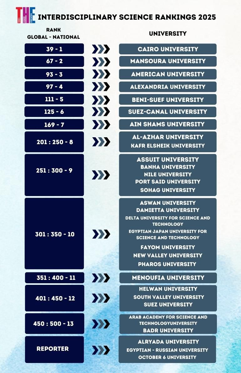 إدراج 27 جامعة مصرية في الإصدار الأول لتصنيف التايمز للتخصصات البينية