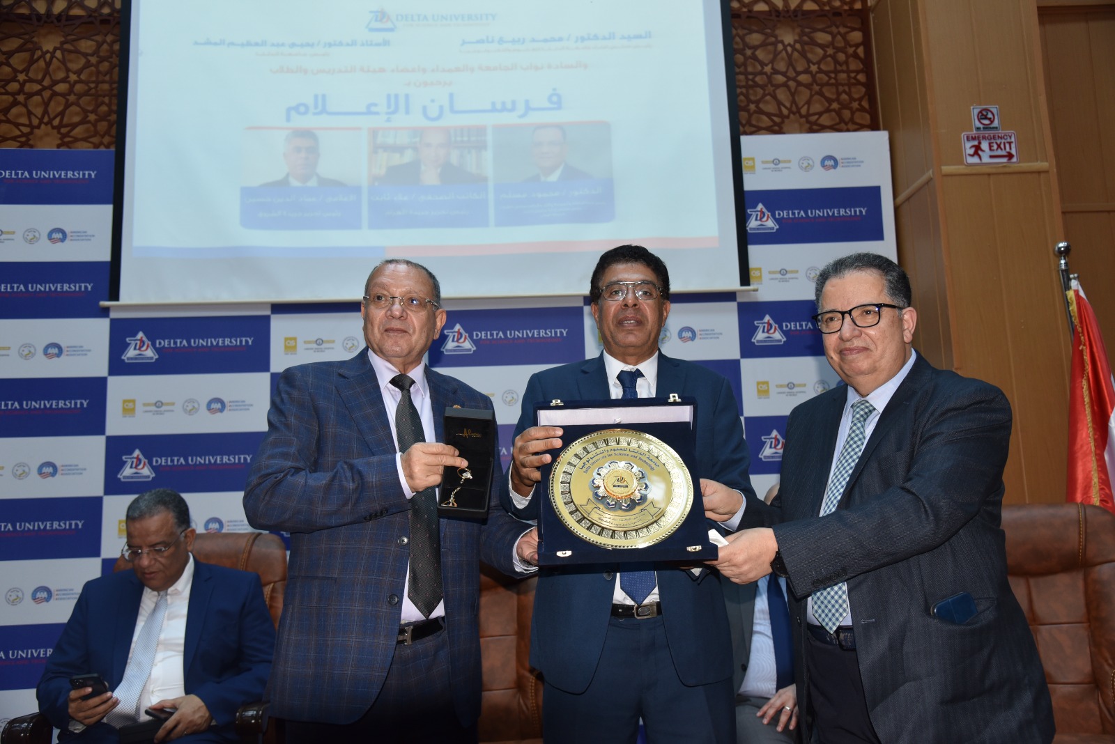 وبنهاية اللقاء تم تسليم درع جامعة الدلتا لفرسان الاعلام تكريماً لجهودهم وعطاءهم المستمر في خدمة الوعي والفكر المستنير متمثلاً في تسخير أقلامهم الصحفية لنقل الأفكار وتفسير مجريات الاحداث عبر أجهزة الاعلام المصرية.