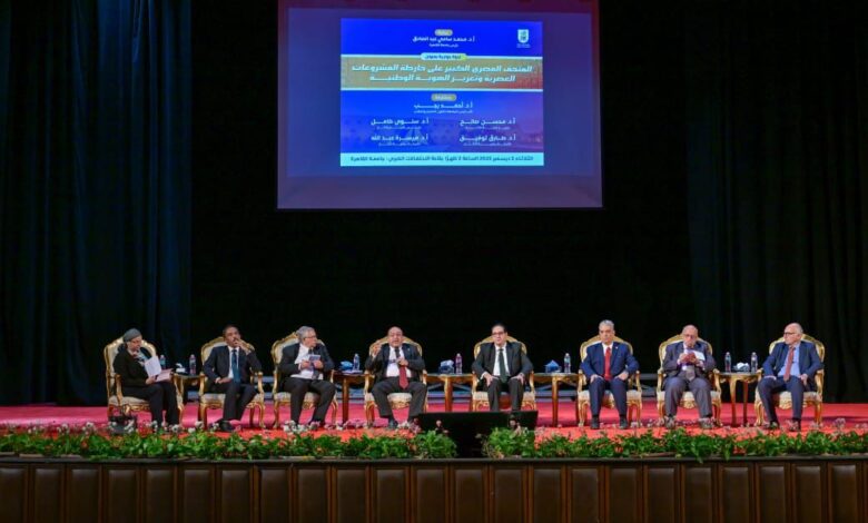 شهدت قاعة الاحتفالات الكبري بجامعة القاهرة، تحت رعاية وحضور الدكتور محمد سامي عبدالصادق رئيس الجامعة، ندوة حوارية تحت عنوان ” المتحف المصري الكبير علي خارطة المشروعات العصرية وتعزيز الهوية الوطنية”، شارك فيها كل من: الدكتور أحمد رجب نائب رئيس الجامعة لشئون التعليم والطلاب، والدكتور محسن صالح عميد كلية الآثار، ود. سلوي كامل رئيس قسم الآثار، ود.طارق توفيق الأستاذ بكلية الآثار، ود. ميسرة عبد الله الأستاذ بكلية الآثار.