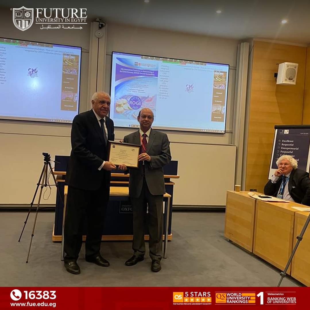 امتد تألق جامعة المستقبل فى المحافل الدولية إلى قيادات الجامعة . منح مركز البحوث للتجاره و الاقتصاد ببريطانيا خلال مؤتمر إعاده هيكله الاقتصاد نحو التنميه المستدامه و المنعقد بجامعه اوكسفورد الزماله الفخريه للأستاذ الدكتور عباده سرحان رئيس جامعه المستقبل على جهوده و عطاؤه فى مجال التعليم و البحث العلمى بمصر