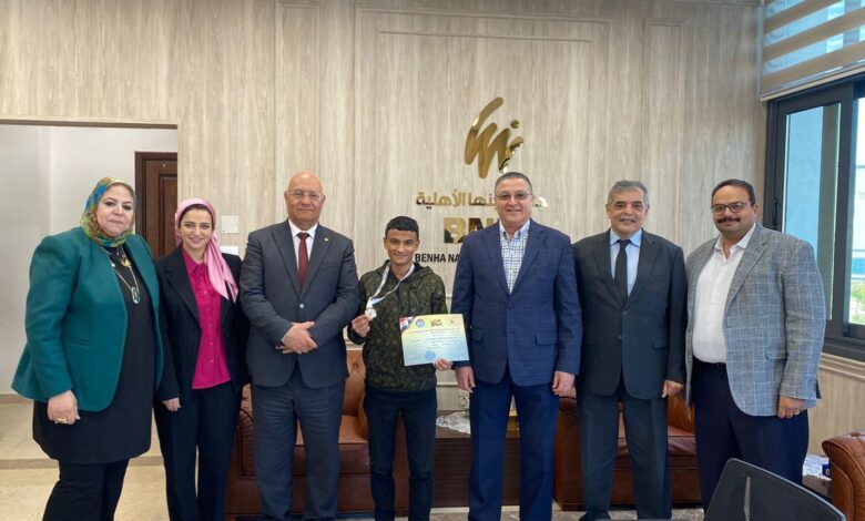كرم الدكتور جمال السعيد رئيس مجلس أمناء جامعة بنها الأهلية والدكتور جمال سوسه القائم بعمل رئيس الجامعة الطالب محمد هشام محمد بالفرقة الأولى بكلية الهندسة لحصوله علي المركز الثانى والميدالية الفضية فى بطولة الجامعات المصرية والمعاهد العليا 51 “للووشو كونغ فو” وزن 48 كجم.