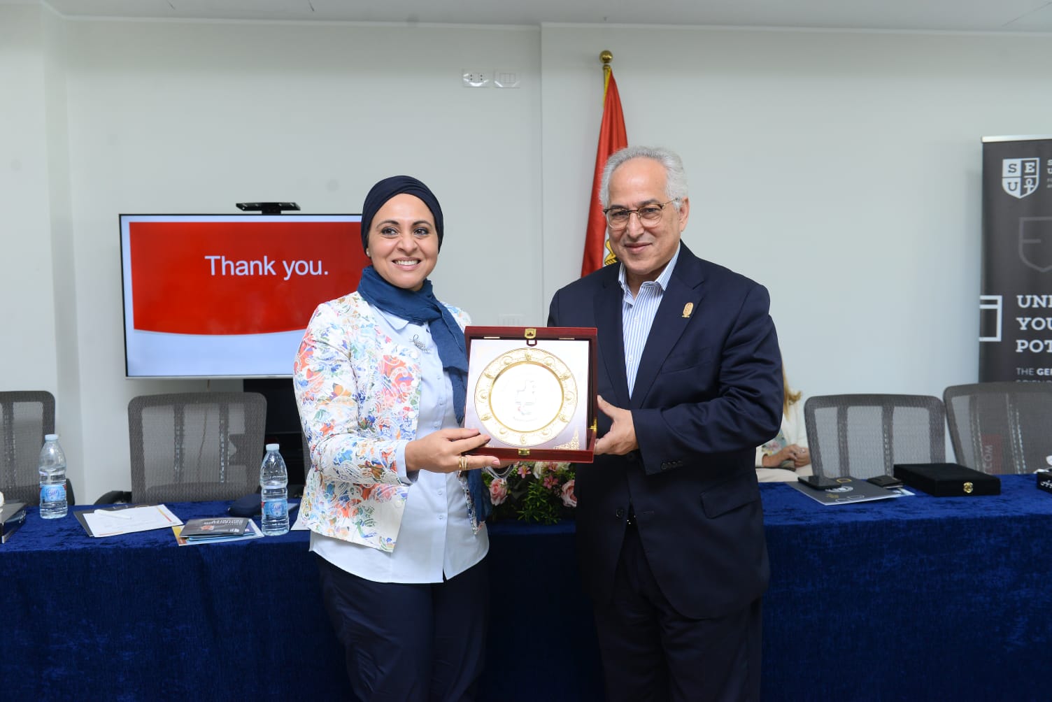 وفي ختام الاحتفالية قدمت الدكتورة غادة بسيونى القائمة بعمل رئيس الجامعة درع الجامعة للدكتور حسام الدين مصطفي رئيس اللجنة البارالمبية المصرية والدكتورة إيمان كريم رئيس المجلس القومى للأشخاص ذوى الاعاقة والدكتور باسم تهامي المدير التنفيذي للأوليمبياد الخاص المصري.