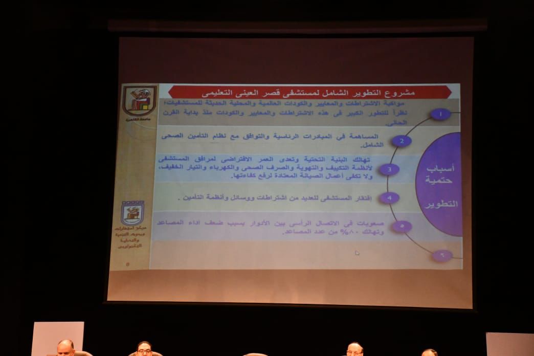 وأكد الدكتور الخشت، خلال المؤتمر الصحفي، أن تطوير مشروع مستشفى قصر العيني التعليمي الجديد، يتضمن ثلاث محاور، أولها: تطوير شامل للبنية التحتية وذلك من خلال رفع كفاءة الأقسام والمعامل، وعزل الأسطح والفواصل، وإحلال وتجديد المصاعد، وصيانة ورفع كفاءبعض الأعمال الصحية، وثانيها: ربط الأنظمة المختلفة بنظام ذكي للتحكم من خلال إحلال وتجديد البنية التحتية والمرافق لكامل المستشفى على مراحل لضمان استمرار جودة الخدمة الطبية؛ وتتضمن إحلال وتجديد شبكةومحطة الغازات الطبية، وإحلال وتجديد شبكات ومحطات الصرف الصحى والإمداد بالمياه، وإحلال وتجديد نظم الإمداد بالكهرباء ورفع كفاءتها، وإحلال وتجديد شبكات ومهمات التيار الخفيف والاتصالات والمعلومات، ورفع كفاءة أنظمة التكييف والتهوية وتجديد المتهالك منها، وثالثها: حوكمة نظم الإدارة وتحديث شامل لنظم المستشفى من خلال وضع خطة لنظام الإدارة بتطبيق معايير الهيئة العامة للاعتماد والرقابة الصحية GHAR لحوكمة نظام الإدارة بالمستشفى وتشمل الخطة التالي حوكمة نظم إدارة العملية الطبية وإجراءاتها ونظم تبادل البيانات بين الأطقم الطبية، وحوكمة عمليات حفظ وتداول المستندات الطبية باستخدام الأنظمة الرقمية، وتحديث البنية التحتية للنظام لنقل البيانات والمعلومات بالمستشفى وأنظمة الاتصال الداخلية بين أطقم العمل وأنظمة الاتصال بين المستشفى والنظام الصحي المحلي، وتدريب الأطقم الطبية، وتحسين أحوال العاملين والمساعدة على استخدام وسائل ونظم الإدارة الرقمية، واستخدام وسائل تداول البيانات الطبية الرقمية.
