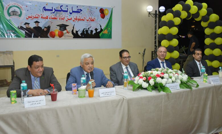 وأعرب الدكتور محمد سامي عبد الصادق، رئيس الجامعة، عن سعادته بالمشاركة في هذا الحفل الذي جاء مواكبا لذكرى انتصارات أكتوبر المجيدة التي برهنت على أن النجاح والتفوق يتحقق بالعزيمة والاصرار وحسن الاستعداد. وقد وجه رئيس الجامعة التحية والتقدير لأعضاء هيئة التدريس الذين شملوا بعطائهم غير المحدود أبناءهم حتى بلغوا مراتب التفوق العلمي، مشيرًا إلى أنها رسالة تثمنها إدارة الجامعة لهم ولا تقل أهمية عما يقدمونه من عطاء في العمل بالجامعة. كما وجه سيادته الشكر لأعضاء مجلس إدارة النادي على الجهد الواضح في تطوير النادي والارتقاء بالخدمات المقدمة لأعضاء هيئة التدريس وأسرهم.