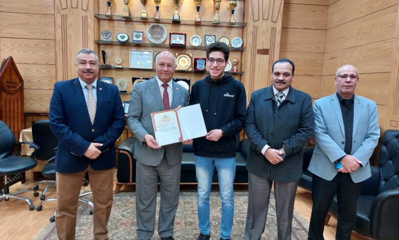 رئيس جامعة بنها يكرم الطالب الفائز في مسابقة بلاك هات بالمملكة العربية السعودية