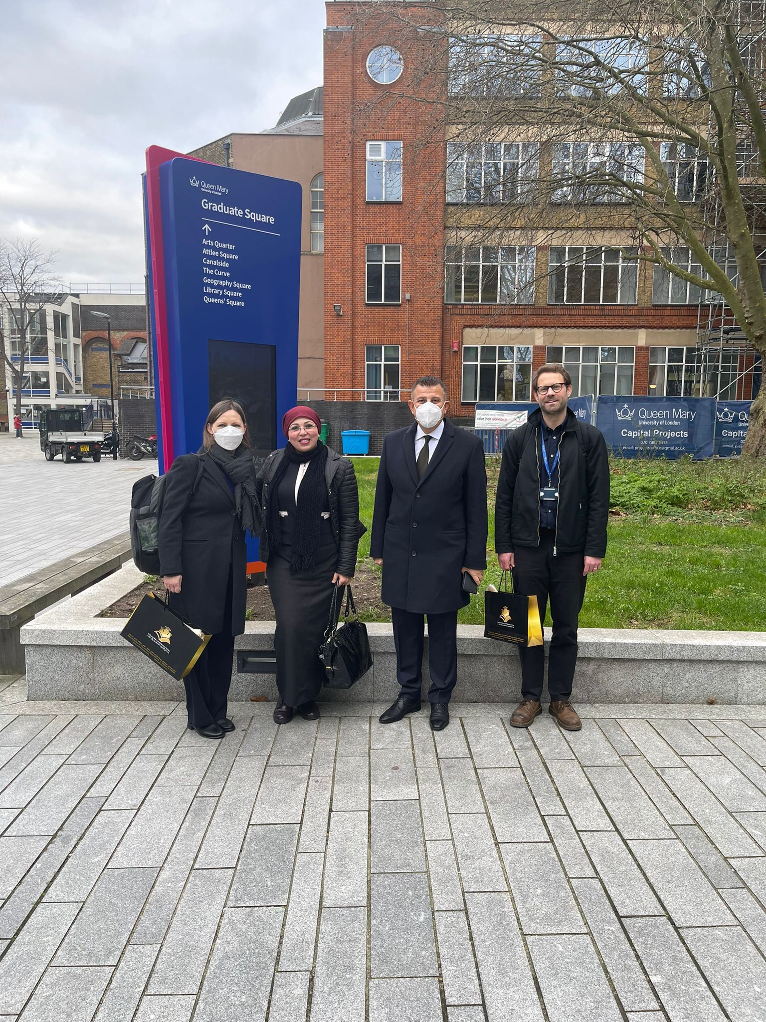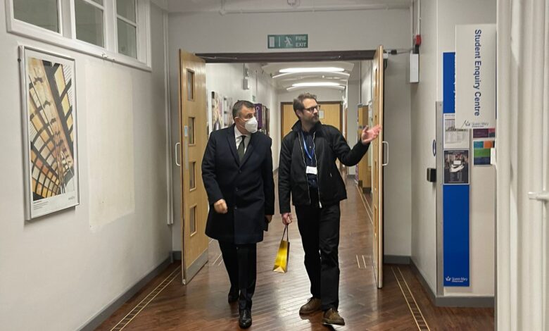 تضمنت الجولة زيارة لجامعة كوين ماري، التقى خلالها بالدكتور كولين جرانت نائب رئيس جامعة كوين مارى للعلاقات الدولية والدكتور أيونيس كوكوريس عميد كلية الدراسات الإنسانية والعلوم الإجتماعية والدكتور بيتر مكورماك الأستاذ بكلية الطب وطب الأسنان والأستاذ مارك كودينجتن مدير المشروعات الدولية والأستاذة آنيتا والتن المدير الإقليمي للعلاقات الدولية بالجامعة. وخلال اللقاء استعرض الجانبان رؤيتهما و أبرز ملامح الخطة الاستراتيجية للشراكات الدولية وكذلك تقديم عرض للخدمات التى تقدمها كلتا الجامعتين للطلاب. كما ناقش الجانبان تعزيز أوجه التعاون الدولي على كافة المستويات من تبادل طلابي وتبادل للأساتذة وتبادل الخبرات فى مراجعة المناهج الدراسية و إنشاء درجات علمية مشتركة فى العلوم الطبية والهندسية وكذلك فى مجال العلوم القانونية بالتعاون مع شعبة اللغة الإنجليزية بكلية الحقوق جامعة عين شمس.