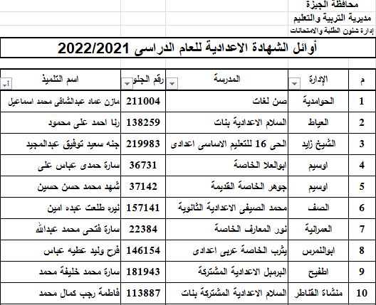 حيث بلغ اجمالى عدد المتقدمين لاداء الامتحانات 183881 طالب وطالبة علي مستوى جميع إدارات الجيزة التعليمية وبلغ اجمالى عدد الطلاب الأوائل للشهادة الاعدادية 91 طالب وطالبة .