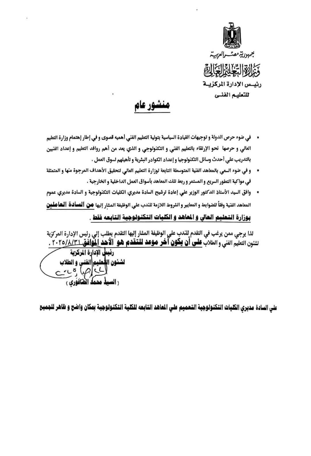 وهناك يكون السؤال : لماذا تم إصدار هذا المنشور الآن لفتح باب التقدم للإنتداب كمديرين لهذه المعاهد والكليات التكنولوجية ـ وخاصة وأن مدة الإنتداب لن تزيد عن شهرين أو ثلاثة من الآن  نظرا لأن إعلان التعيين الدائم على هذه الوظائف سيأتى من الجهاز المركزى للتنظيم والإدارة سيكون بعد شهرين أو ثلاثة على الأكثر  وسيتم التعيين عليها لمن سينطبق عليه الشروط وقتها ؟