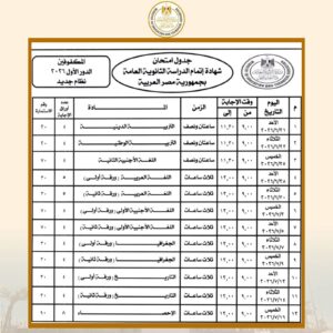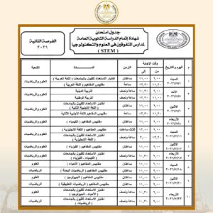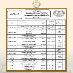 كما تبدأ امتحانات شهادة إتمام الثانوية العامة بمدارس المتفوقين في العلوم والتكنولوجيا “STEM” (الفرصة الأولى) يوم 16 مايو 2026 وتنتهي يوم 20 يونيو 2026، وتبدأ امتحانات (الفرصة الثانية) يوم السبت 4 يوليو 2026 وتنتهي يوم 22 يوليو 2026.