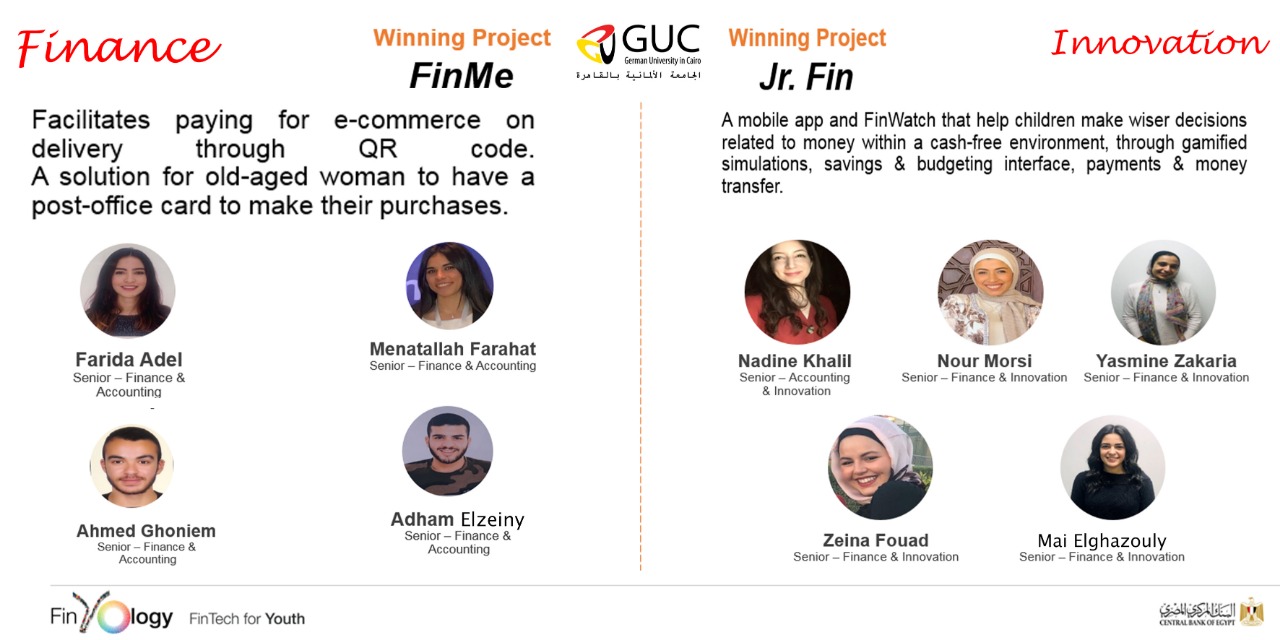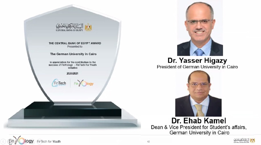 شارك مجموعة من طلبة قسمي التمويل ، و الأبتكار و ريادة الأعمال بكلية تكنولوجيا الأدارة بالجامعة الألمانية بالقاهرة في مبادرة FinYology-FinTech for Youth التي أطلقها البنك المركزي المصري وتسعى لنشر الوعي و تنمية الابتكار في مجالات وتطبيقات التكنولوجيا المالية وتتواكب مع جهود الدولة المبذولة لتحقيق أهداف الشمول المالي والتحول الرقمي ، وذلك بالتعاون مع عدد من البنوك – شملت الأهلي المصري، بنك مصر، الإمارات دبي الوطني، قطر الوطني، الإسكندرية – و شارك فيها عدد من الجامعات – منها الأمريكية بالقاهرة ، الجيزة الجديدة ، الأكاديمية العربية للعلوم والتكنولوجيا والنقل البحري إضافة للجامعة الألمانية بالقاهرة ، حيث بدأت المبادرة بمسابقة تنافسية شارك فيها عدد206 طالب وطالبة بالسنة الدراسية الرابعة بقسمى التمويل ، و الابتكار وريادة الاعمال ، وتم تكليفهم بإعداد مشروعات بحثية حول مجالات و تطبيقات التكنولوجيا المالية ، كما حوى برنامج المبادرة تقديم محاضرة متخصصة جاءت فى إطار نشر الوعى بمفهوم التكنولوجيا المالية من جانب الدكتورة رشا نجم – وكيل المحافظ المساعد لقطاع نظم الدفع وتكنولوجيا المعلومات بالبنك المركزى.