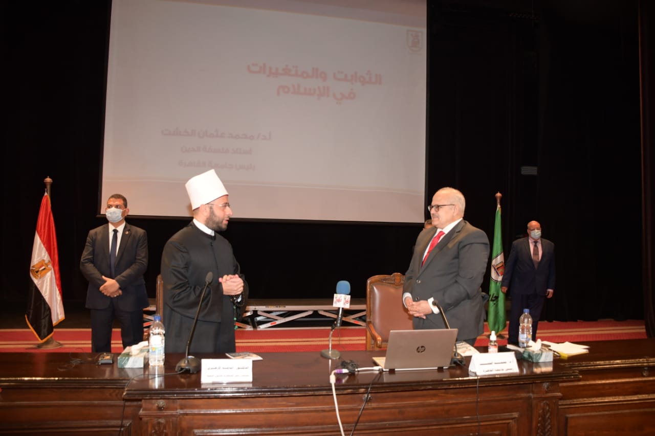شهدت قاعة الاحتفالات الكبرى بجامعة القاهرة، محاضرة مشتركة عن “الثوابت والمتغيرات في الإسلام” للدكتور محمد عثمان الخشت رئيس جامعة القاهرة، والدكتور أسامة الأزهري مستشار رئيس الجمهورية للشؤون الدينية، في إطار مشروع جامعة القاهرة لتأسيس خطاب ديني جديد، وبحضور نواب رئيس الجامعة وعمداء الكليات والأساتذة والطلاب.