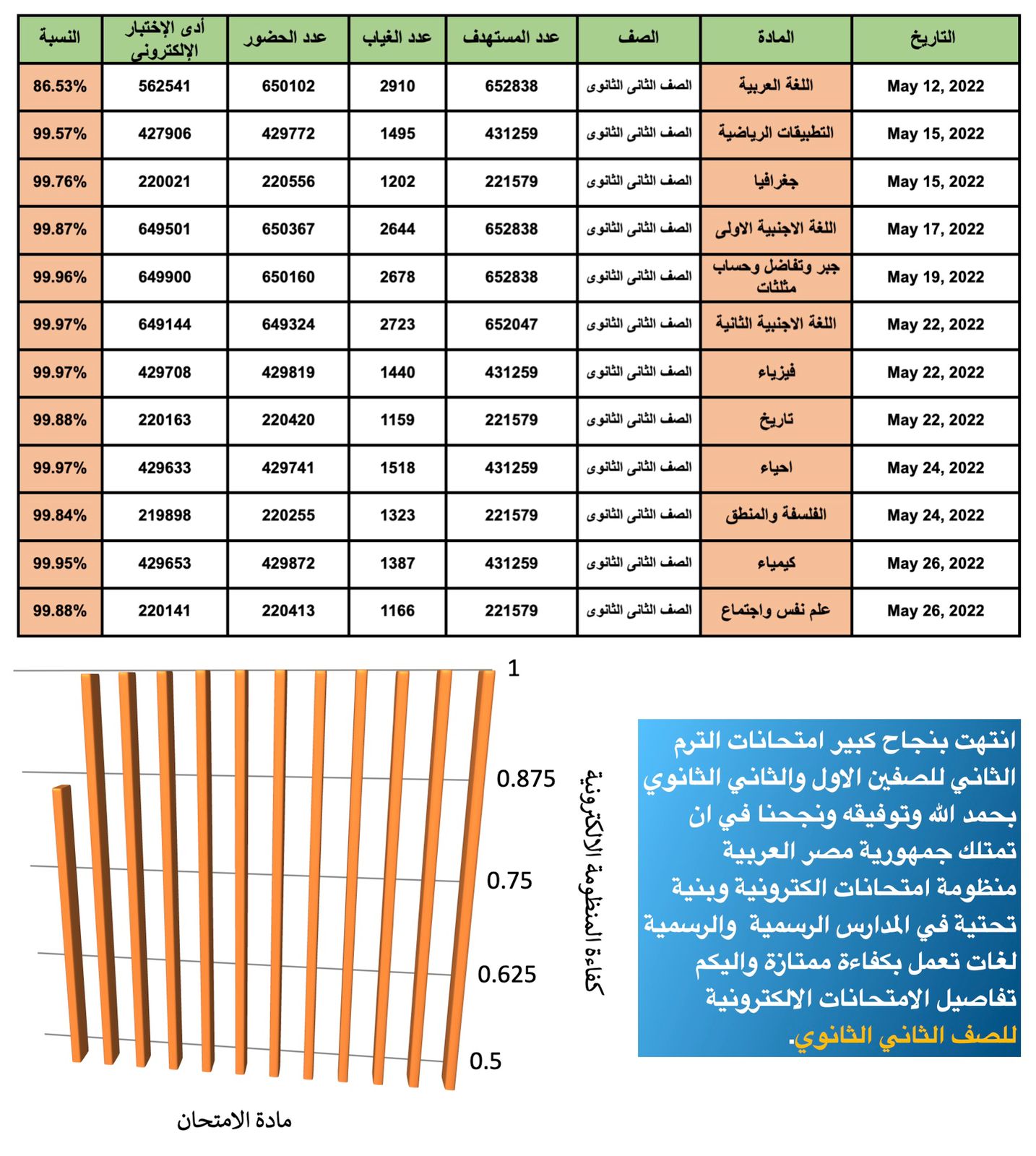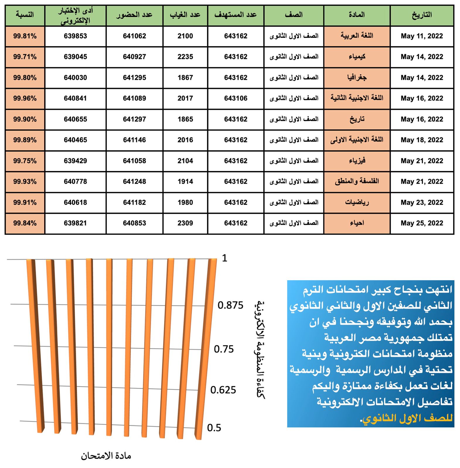 أعلن الدكتور طارق شوقى وزير التربية والتعليم التقرير النهائي للامتحانات الالكترونية للصفين الاول والثانى  الثانوي لعام ٢٠٢١-٢٠٢٢.رصد التقرير اعداد الطلاب الذين حضروا الامتحانات بالفعل والنسب المئويه الخاصة بأداء الامتحان الالكترونى باستخدام التابلت .كما رصد التقرير  الاعد المحدوده من المتغيبين عن أداء الامتحانات .وكشف التقرير عن ارتفاع نسب الحضور وارتفاع الاعداد الخاصه بالطلاب الذين أدوا الامتحانات وتنشر التعليم اليوم صور من التقرير النهائى لطلاب اولى وثانيه ثانوى فى جميع المواد