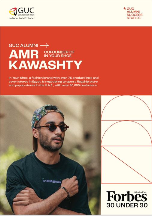 وجاء إختيار أولهما عمرو قوشتي ضمن القائمة كشريك مؤسس شركة (In Your Shoe) التي انشائها بالتعاون مع عز الدين طارق وهي شركة متخصصة في بيع الملابس والإكسسوارات ، بدأت أولى خطواتها عام 2018 بأنتاج الجوارب ذات التصميمات المرحة و المبهجة و من ثم توسعت في تصميم منتجات تحوى أفكار مبدعة وخلاقة تسمح للشباب بالتعبير عن انفسهم من خلال ” الموضة ” حيث ارتفعت قيمة علامتها التجارية كشركة للأزياء تقدم انواع مختلفة من المنتجات منها : الملابس الرياضية – السباحة – حقائب الوسط -القبعات – حافظات اللابتوب – بالاضافة للملابس الخاصة بالشباب والفتيات ، وتمتلك حالياً ما يقرب من 75 خط إنتاج وعدد7 متاجر بيع للملابس في مصر ، كما باعت الشركة نحو 400 ألف قطعة في 20 دولة أغلبها في مصر ودول مجلس التعاون الخليجي.