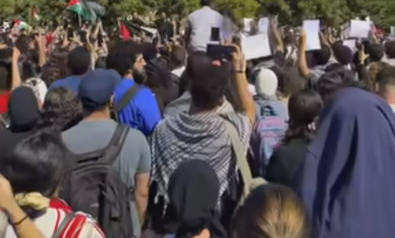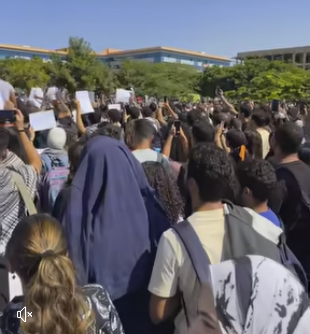 وردد الطلاب هتافات تضامنية مع الشعب الفلسطينى منها ” القدس عربية، الفلسطينين اصحاب الارض” «عاشت فلسطين» و«لا للإبادة الجماعية للفلسطينين»وقاموا برفع علم فلسطين