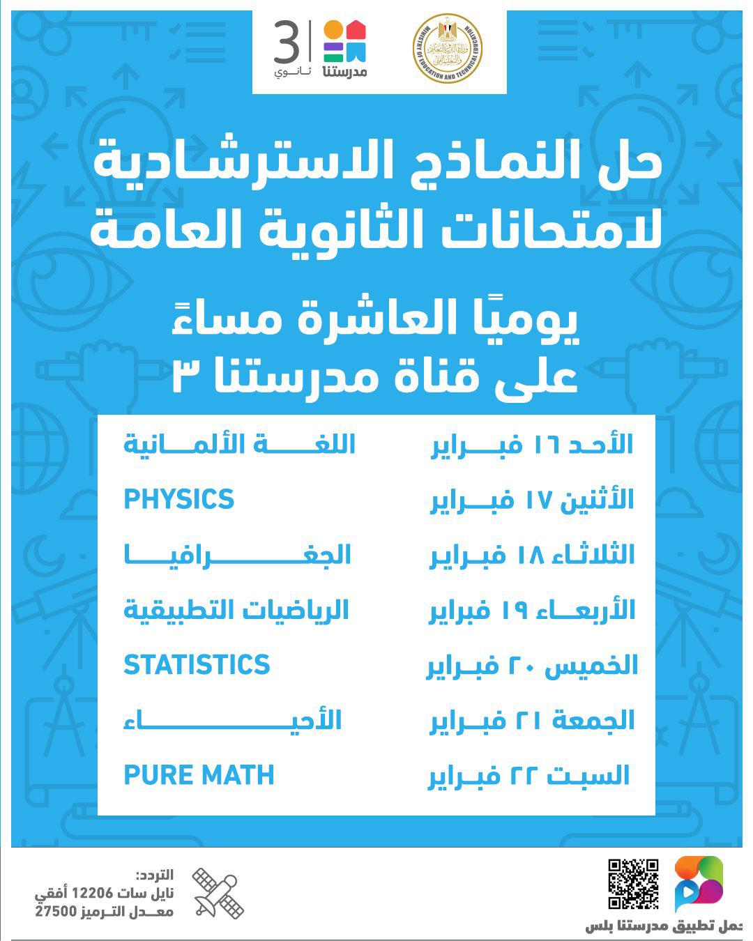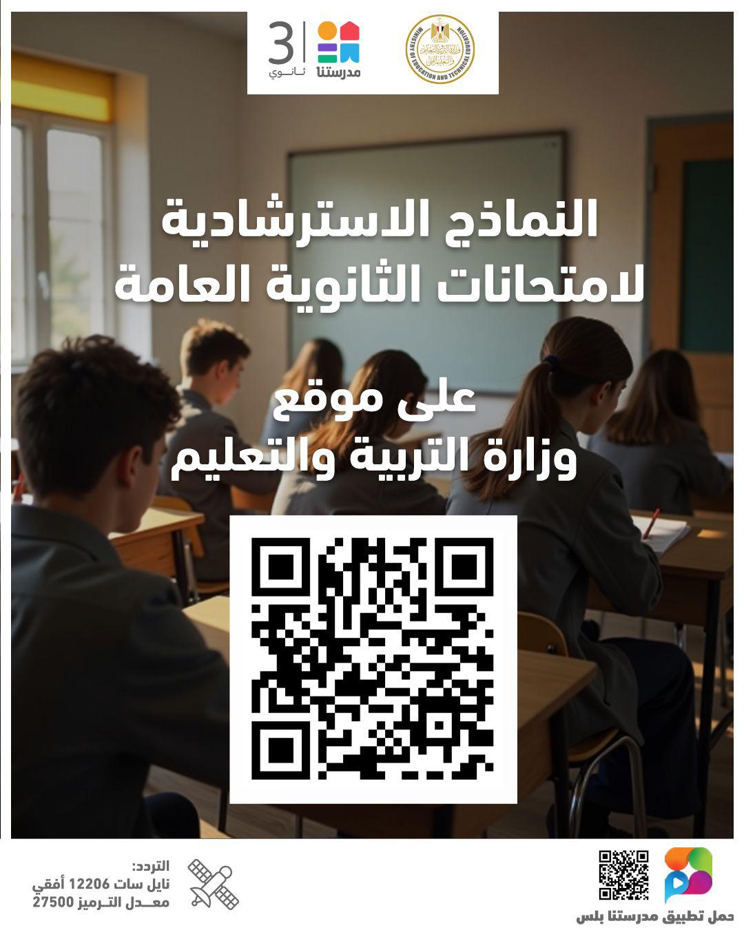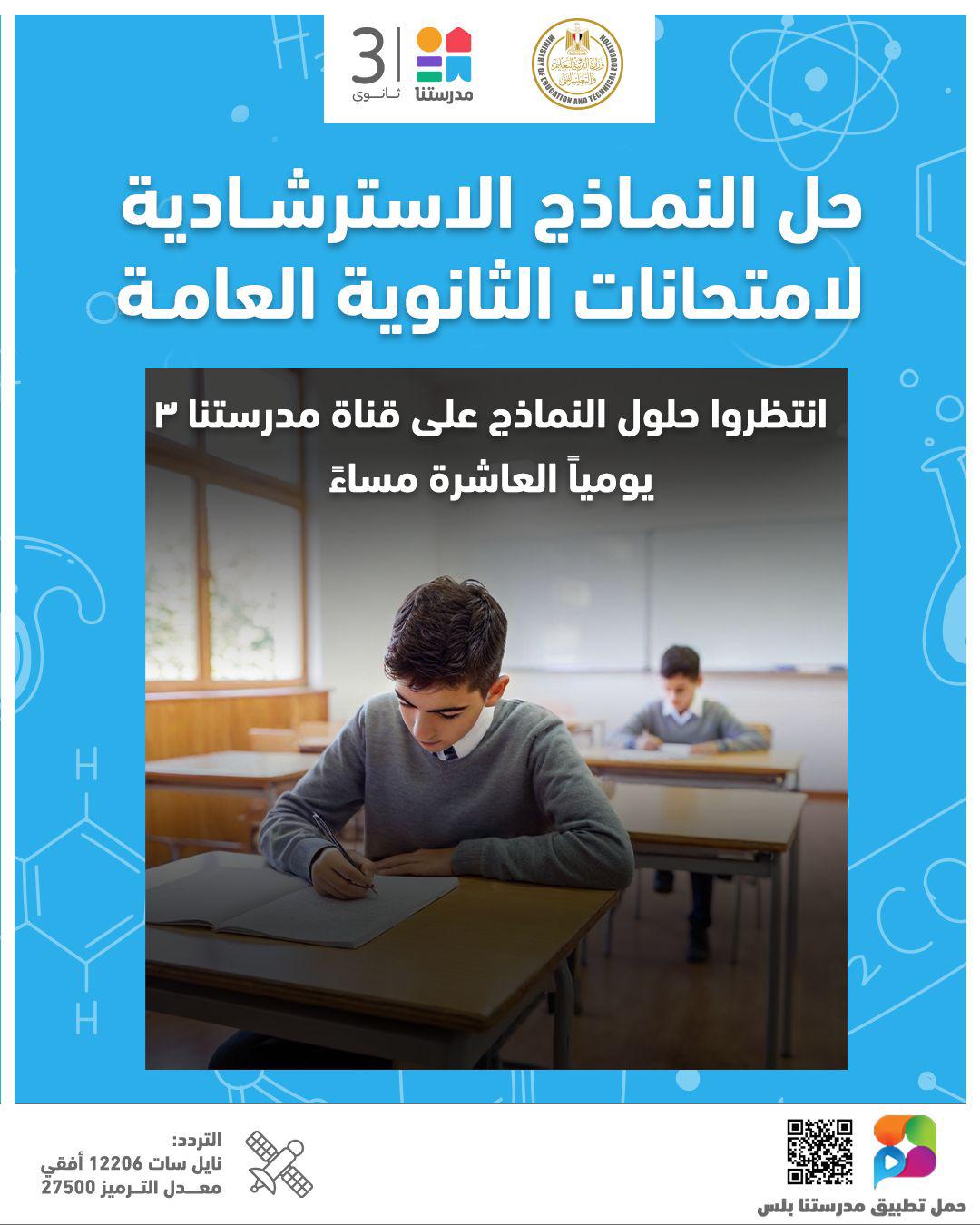 وزارة التربية والتعليم تعلن إتاحة النماذج الاسترشادية لامتحانات الثانوية العامة على موقع الوزارة…وإتاحة حل النماذج يوميًا على قناة “مدرستنا٣”
