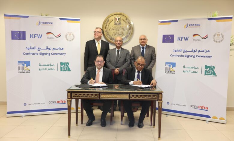 وقعت وزارة التربية والتعليم والتعليم الفني، ومؤسسة مصر الخير، عقود التصميم المعماري لإنشاء مركزي تميز في الطاقة المتجددة، وكفاءة الطاقة في محافظتي المنيا وأسوان، وعقود أعمال البناء والتأهيل لمدرستين ثانويتين، فنيتين وذلك فى إطار عمل أنشطة مشروع “تعزيز التعليم الفني والتدريب المهني لقطاع الطاقة الجديدة والمتجددة”، بالتعاون مع بنك التعمير الألماني.