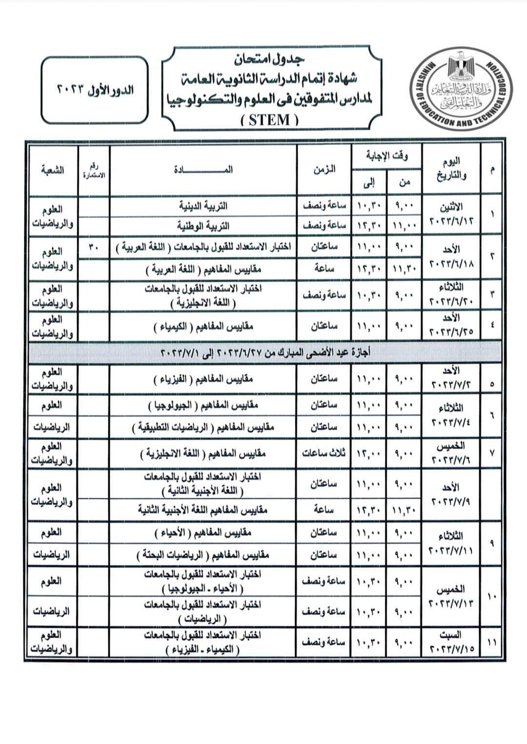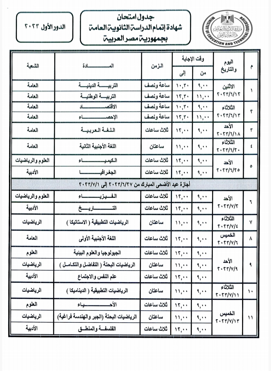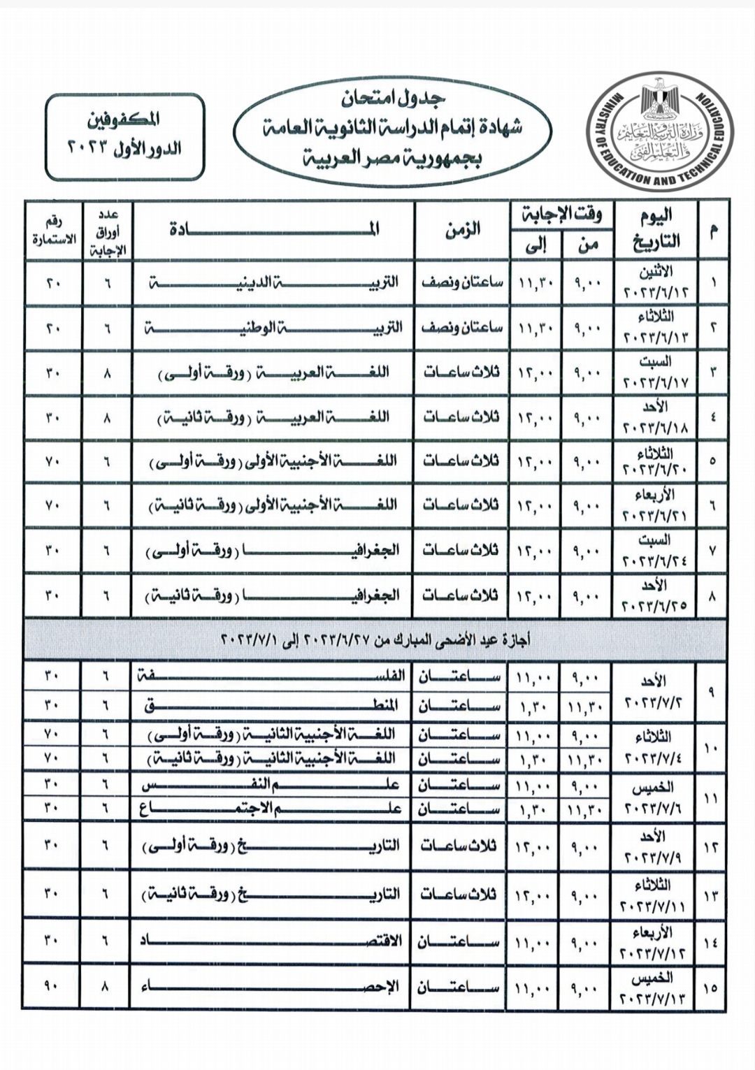 ومن المقرر أن تبدأ الامتحانات يوم الإثنين الموافق 2023/6/12 وتستمر حتى السبت الموافق 2023/7/15.