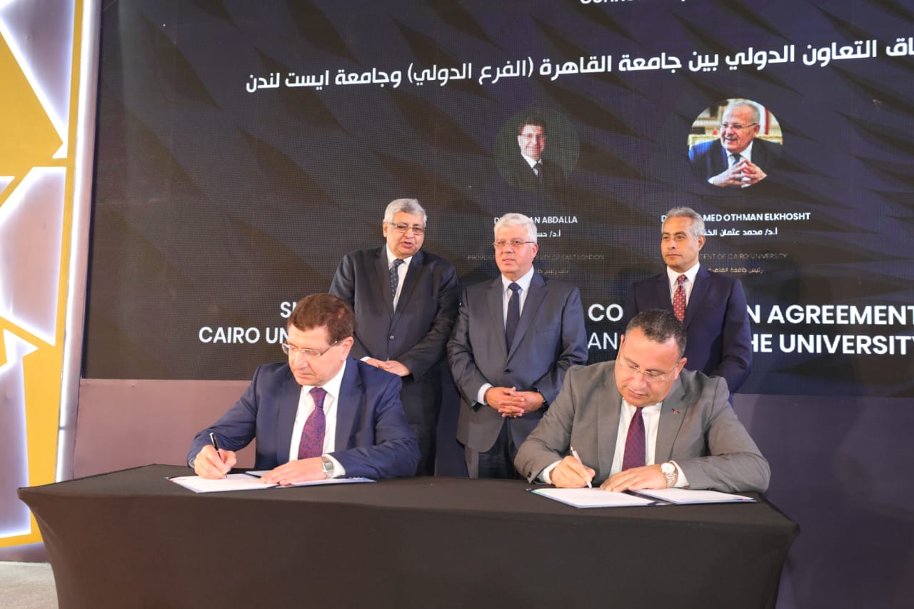 (الثاني) اتفاقية تعاون بين جامعتي القاهرة وإيست لندن؛ بهدف تطوير مجموعة من البرامج متعددة التخصصات، والتي تلبي الاحتياجات والمهارات الاقتصادية، والتطلعات المهنية المحلية والدولية للطلاب، وكذلك التعاون فى منح درجات علمية مزدوجة من كلتا الجامعتين، وتبادل زيارات أعضاء هيئة التدريس والطلاب، وإجراء الأبحاث العلمية المشتركة، والإشراف المشترك على رسائل الماجستير والدكتوراه، وتبادل المواد العلمية والأكاديمية، وتقديم دورات تفاعلية عبر الإنترنت، فضلًا عن تقديم برامج قصيرة المدى لدراسة اللغة.