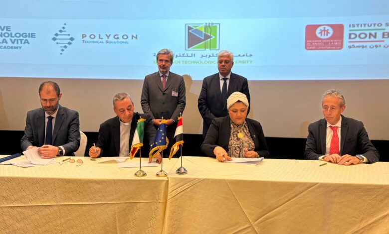 على هامش مؤتمر الاستثمار المصري الأوروبي الذي تستضيفه القاهرة تحت عنوان “مصر والاتحاد الأوروبي”، برعاية وتشريف السيد الرئيس عبدالفتاح السيسي رئيس الجمهورية والسيدة أورسولا فون دير لاين رئيسة المفوضية الأوروبية، شهد الدكتور أيمن عاشور وزير التعليم العالي والبحث العلمي والسفير ميشيل دواروني سفير إيطاليا، توقيع مذكرة تفاهم رباعية مُشتركة بين جامعة القاهرة الجديدة التكنولوجية والمعهد التقني العالي للتقنيات الجديدة للصنع في إيطاليا، وشركة دانيللي الإيطالية، ومعهد دون بوسكو في برنامج تكنولوجيا الميكاترونكس.